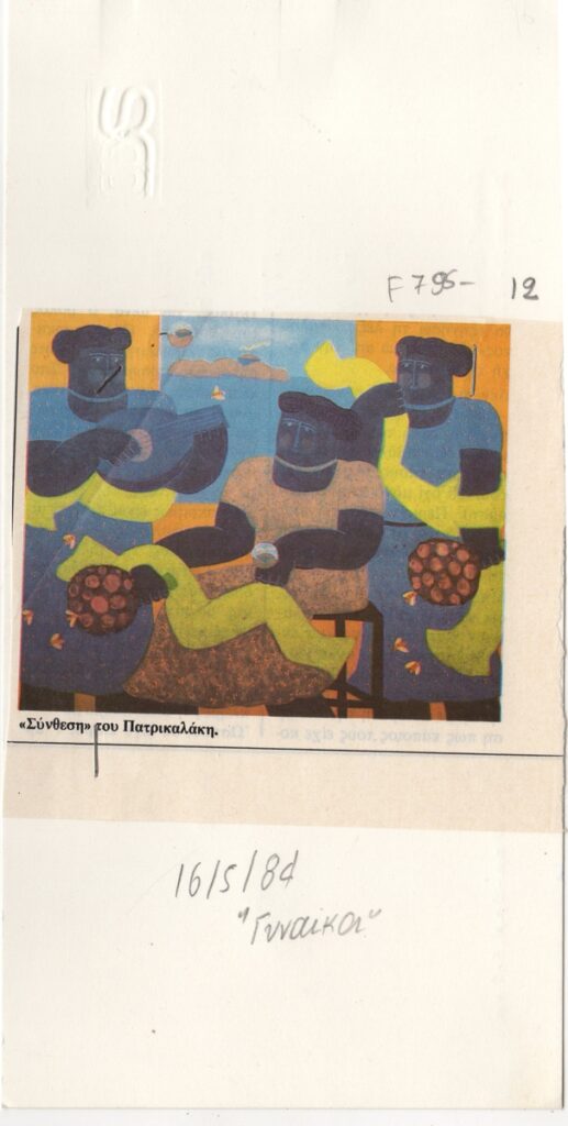 Sikeliotis Giorgos (1917 - 1984) ; Tsarouchis Yannis (1910 - 1989) ; Antonakatou Diana (1922 - 2011) ; Vakalo Giorgos (1902 - 1991) ; Katsireas Stavrianos (1937) ; Komianou Aria (1938 - 2015) ; Venios Markos (1946) ; Parmakelis Yannis (1932) ; Ρόζα Ηλιού (1930) ; Vasilis Kelaidis (1938) ; Kleopa Thaleia (1928) ; Michelis Effie P. (1906 - 1984) ; Γιώργος Μοσχίδης ; Patrikalakis Faidon (1935 - 2017) ; Maria Pop (1925 - 2009) ; Λυδία Σαρρή (1940) ; Giorgos Stathopoulos (1944) ; Ελένη Παπαδάκη ; Prinopoulou Fofo (20th century) ; Λίζα Μπόταση-Δεληβάνη ; Chatzinas, Dimitris (1929 - 2009) ; Pantelias Miltos (1954) ; Ρόζα Μαρμαρίδου
