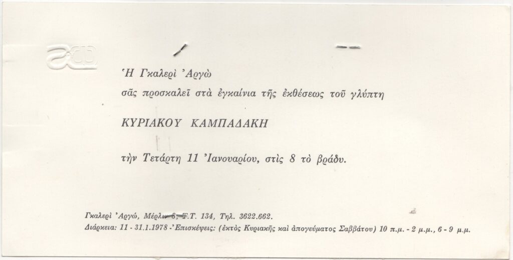 Nikos Engonopoulos (1907 - 1985) ; Gyzis Nikolaos (1842 - 1901) ; Merkouri Melina (1920 - 1994) ; Polymeris Manolis (1951) ; Kazimir Malevich ; Theodoros (Papadimitriou) (1931 - 2018) ; Takis (Vassilakis Panayiotis) (1925 - 2019) ; Bati Olga ; Jacques Lang ; Γιάννης Κουνέλλης (1936 - 2017) ; Daniel Gounaridis (1934) ; Vasilis Kelaidis (1938) ; Lytras Nikiforos (1832 - 1904) ; Patrikalakis Faidon (1935 - 2017) ; Νικόλας Λάσκαρης (1947) ; Μαρία Βασιλάκη (1957) ; Σταύρος Μιχαλαριάς ; Κάρολος Καμπελόπουλος ; Κλέων Βουτυράς
