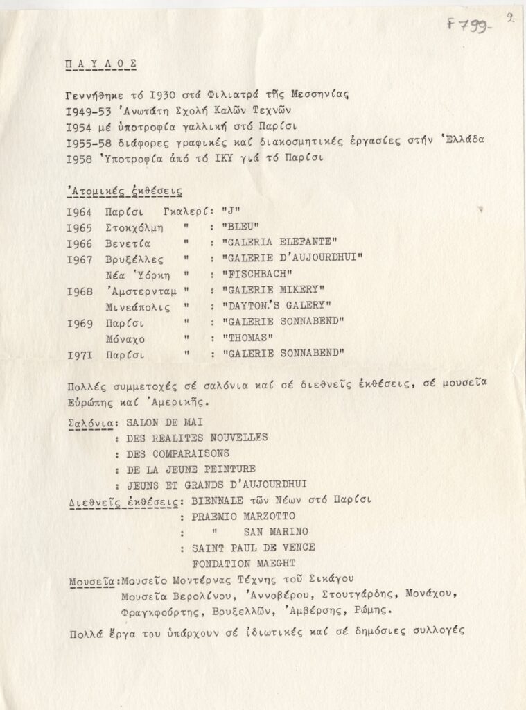 Spiteri-Veropoulou Ioanna (1920 - 2000) ; Vafeiadis Markos (1906 - 1992) ; Raftopoulou Bella (1902 - 1992) ; Pavlos (Dionyssopoulos) (1930 - 2019) ; Christoforou John (1921 - 2014) ; Fassianos Alekos (1935 - 2022) ; Μανώλης Καλλιγιάννης ; Simossi Gabriela (1926 - 1999) ; Tsarouchis Yannis (1910 - 1989) ; Tsoclis Costas (1930) ; (Panagopoulos) Daniel (1924 - 2008) ; Koulentianos Kostas (1918 - 1995) ; Vyzantios Ntikos (1924 - 2007) ; Tzolaki Rena (1930) ; Angelopoulos Aristomenis (1900 - 1990) ; Philolaos (Tloupas) (1923 - 2010) ; Fokas Yannis (1951) ; Κώστας Χαραλαμπίδης (1946) ; Pierrakos Alkis (1920 - 2017) ; Sperantzas Vassilis (1938) ; Karavouzis Sarantis (1938 - 2011) ; Yulika Lakeridou (1940) ; Kindynis Anna (1914 - 2003) ; Kriezi Tita (1930 - 2021) ; Lyberaki Aglaia (1923 - 1985) ; Κώστας Μακρής ; Maltezos Yannis (1915 - 1987) ; Molfesis Iasson (1925 - 2009) ; Κωνσταντίνος Μόραλης ; Bouteas Yannis (1941 - 2026) ; Xenakis Constantinos (1931 - 2020) ; Pastra Nausica (1921 - 2011) ; Gisele Πράσινου ; Tsekoura, Vassiliki (1947) ; Πάνος Ελευθερίου ; Δημήτρης Ράτσικας (1946) ; Νίκος Δαμιανάκης (1920 - 2005) ; Pantelias Miltos (1954) ; Νίκος Τσιώτης ; Εριέττα Βορδώνη (1959) ; Κωνσταντίνος Γιαννικούρης