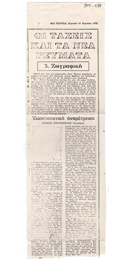 Engonopoulos Nikos (1907 - 1985) ; Theodorakis Mikis (1925 - 2021) ; Tsitsanis Vasilis (1915 - 1984) ; Vassiliou Spyros (1902 - 1985) ; Sikeliotis Giorgos (1917 - 1984) ; Migadis Yannis (1926 - 2017) ; Tsarouchis Yannis (1910 - 1989) ; Petropoulos Ilias (1928 - 2003) ; Solomos Alexis (1918 - 2012) ; Argyrakis Minos (1920 - 1998) ; Νίκος Γκάτσος (1914 - 1992) ; Karas Christos (1930 - 2023) ; Anoyanakis Fivos (1915 - 2003) ; Valaoritis Nanos (1921 - 2019) ; Νίκος Κούνδουρος ; Christakis Leonidas (1929 - 2009) ; Tachtsis Kostas (1927 - 1988) ; Μίμης Πλέσσας (1924 - 2024) ; Kaniaris Vlassis (1928 - 2011) ; Mavroidis Georgios (1912 - 2003) ; Hatzidakis Manos (1925 - 1994) ; Moschidis Pavlos (1927 - 2004) ; Μανώλης Σκουλούδης ; Θεόδωρος Αντωνίου (1935 - 2018) ; Λούλα Αναγνωστάκη (1928 - 2017) ; Νικηφόρος Ρώτας (1929 - 2004) ; Γιώργος Πυρουνάκης (1910 - 1988) ; Guy-Michel Saunier