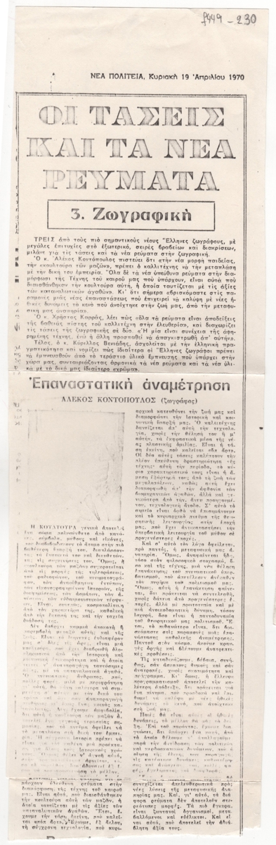 Andreou Kostas (1917 - 2007) ; Spiteri-Veropoulou Ioanna (1920 - 2000) ; Touyas Giorgos (1922 - 1994) ; Christoforou, John (1921 - 2014) ; Karras Christos (1930 - 2023) ; Αντώνης Καραχάλιος ; Koulentianos Kostas (1918 - 1995) ; Gaϊtis Yannis (1923 - 1984) ; Γιάννης Τσάμης (1920) ; Prassinos Marios (1916 - 1985) ; Philolaos (1923 - 2010) ; Kaniaris Vlassis (1928 - 2011) ; Liberaki Aglae (1923 - 1985) ; Ιάσων Μολφέσης (1925 - 2009) ; Chryssostalis Costas