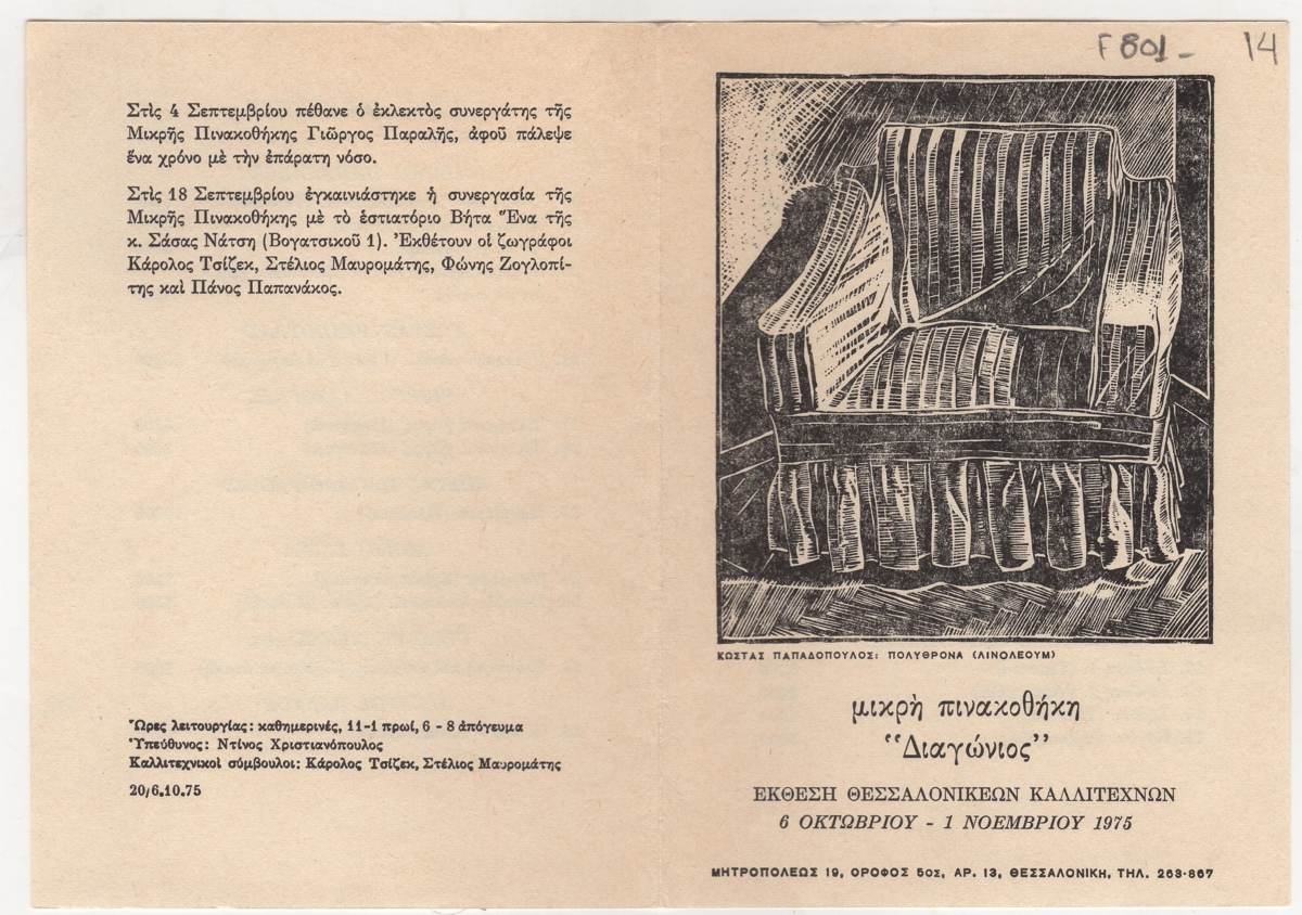 Spiteri-Veropoulou Ioanna (1920 - 2000) ; Panourgias Thymios (1931 - 2015) ; Chalepa-Katsatou Katerina (1925 - 2004) ; Χρήστος Γεωργίου ; Karympaka-Negreponti Argyro (1929) ; Ledaki Maria (1932) ; Μάριος Λοβέρδος ; Σωσώ Παπαδοπεράκη ; Χρήστος Ρηγανάς (1944) ; Αμαλία Βαμβάκου (1925 - 2014) ; Κώστας Δομπούλας ; Fanakidis Apostolos (1945) ; Αλίκη Χατζή (1923 - 1997) ; Ελένη Αποστολοπούλου (1943) ; Νικόλαος Δογούλης ; Βασιλική Γρουσοπούλου-Μαρκούση (1938) ; Κολέτ Δάρρα (1942) ; Γιώργος Χουλιαράς, εικαστικός (1947)