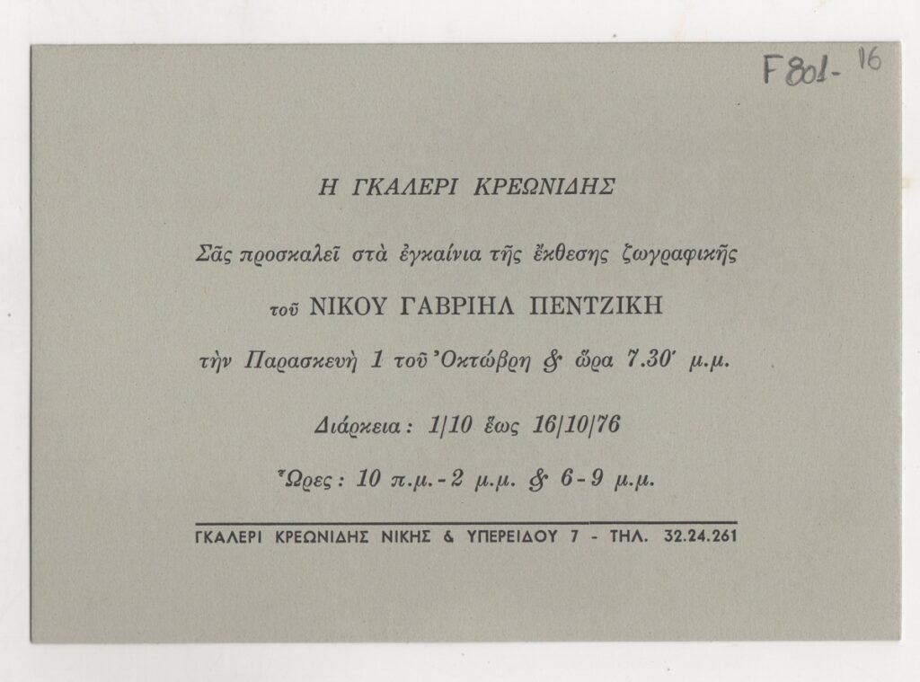 Stathopoulou Eleni (1914 - 2016) ; Vassiliou Spyros (1902 - 1985) ; Kontoglou Fotis (1895 - 1965) ; Hatzikyriakos-Ghika Nikos (1906 - 1994) ; Moralis Yannis (1916 - 2009) ; Fassianos Alekos (1935 - 2022) ; Sikeliotis Giorgos (1917 - 1984) ; Migadis Yannis (1926 - 2017) ; Theofilos (Chatzimichail) (24/03/1934) ; Thomas Fanourakis (1915 - 1993) ; Fokas Andreas (1928 - 2021) ; Nikos Gavriil Pentzikis (1908 - 1993) ; Marios Vatzias (1926 - 2008) ; Ανδρέας Βουρλούμης ; Georgas Michalis (1947) ; Karagatsi Niki (1914 - 1986) ; Michalis Makroulakis (1940 - 2023) ; Malamos Kostas (1913) ; Manousakis Giorgos (1914 - 2003) ; Patrikalakis Faidon (1935 - 2017) ; Λυδία Σαρρή (1940) ; Stathopoulos Giorgos (1944) ; Νικολάου ; Βογιατζής