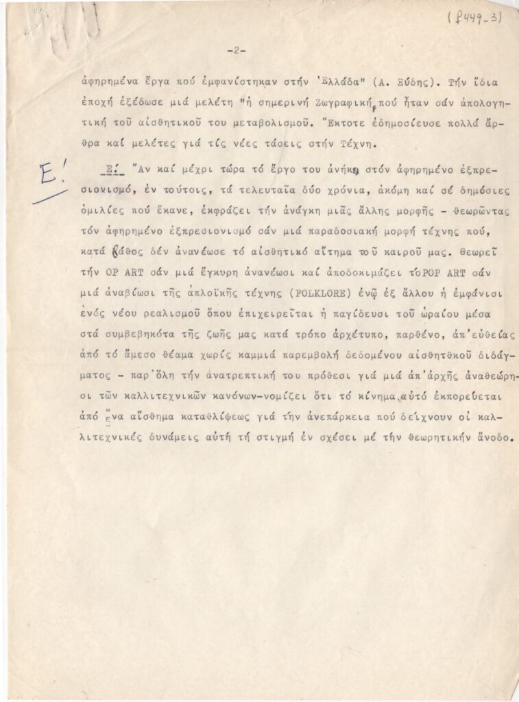 Andreou Kostas (1917 - 2007) ; Fatouros Dimitris (1928 - 2020) ; Spiteri-Veropoulou Ioanna (1920 - 2000) ; Eugène Delacroix (1798 - 1863) ; Touyas Giorgos (1922 - 1994) ; Simossi Gabriela (1926 - 1999) ; Tsoclis Costas (1930) ; Sklavos Yerassimos (1927 - 1967) ; Άγγελος Αγγελόπουλος (1904 - 1995) ; Kontopoulos Alekos (1904 - 1975) ; Mylonas Alex (1923 - 2016) ; Vyzantios Ntikos (1924 - 2007) ; Berto Lardera ; Valsamis Kostas (1908 - 2003) ; Gaitis Yannis (1923 - 1984) ; Le Corbusier (1887 - 1965) ; Georges Mathieu (1921 - 2012) ; Theodoros (Papadimitriou) (1931 - 2018) ; Takis (Vassilakis Panayiotis) (1925 - 2019) ; Victor Vasarely ; Philolaos (Tloupas) (1923 - 2010) ; Kessanlis Nikos (1930 - 2004) ; Kriezi Tita (1930 - 2021) ; Lyberaki Aglaia (1923 - 1985) ; Maltezos Yannis (1915 - 1987) ; Molfesis Iasson (1925 - 2009) ; Paniaras Kostas (1934 - 2014) ; Karras Kostas (1936 - 2012) ; Γιώργος Βαφειάδης