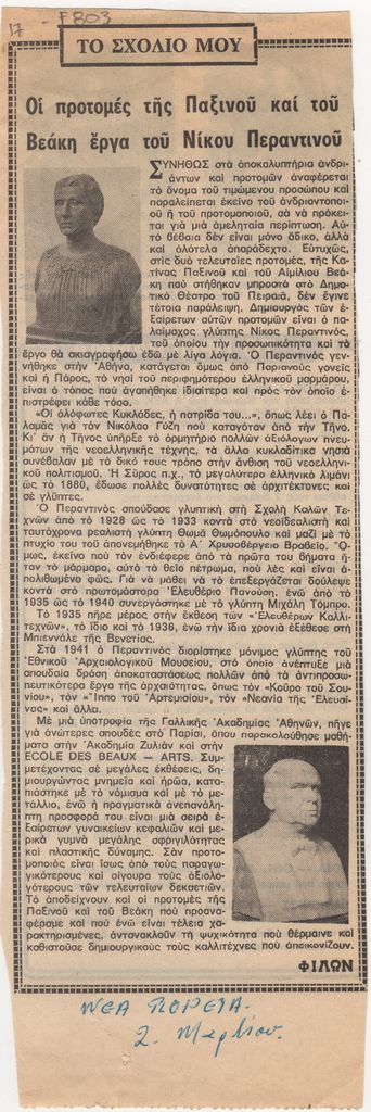 Spiteri-Veropoulou Ioanna (1920 - 2000) ; Michalis Tompros (1889 - 1974) ; Chalepas Yannoulis (1851 - 1938) ; Raftopoulou Bella (1902 - 1992) ; Christos Kapralos (1909 - 1993) ; Sklavos Yerassimos (1927 - 1967) ; Zongopoulos Giorgos (1903 - 2004) ; Thanasis Apartis (1899 - 1972) ; Achilleas Aperghis (1909 - 1986) ; Sochos Antonios (1888 - 1975) ; Mylonas Alex (1923 - 2016) ; Kostas Koulentianos (1918 - 1995) ; Valsamis Kostas (1908 - 2003) ; Avramidis Ioannis (1922 - 2016) ; Theodoros (Papadimitriou) (1931 - 2018) ; Lazaros Lameras (1913 - 1998) ; Philolaos (Tloupas) (1923 - 2010) ; Georgiou Georgios (1916 - ?) ; Apergis Antonis (1938 - 2018) ; Pappas Giannis (1913 - 2005) ; Ikaris Nikolaos (1920 - 1994) ; Loucopoulos, Clearchos (1906 - 1995) ; Lyberaki Aglaia (1923 - 1985) ; Κωστής Παπαχριστόπουλος (1906 - 2004) ; Parandinos Nikolaos (1910 - 1991)