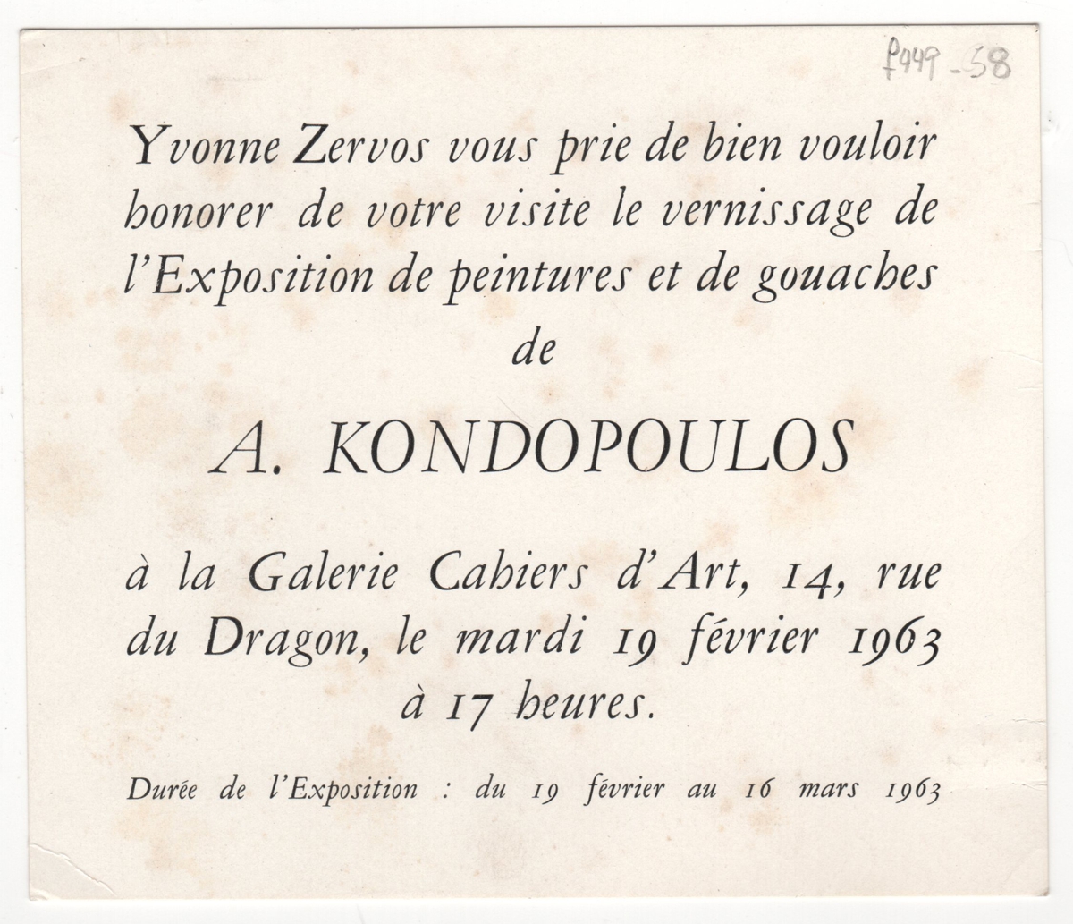 Andreou Kostas (1917 - 2007) ; Fatouros Dimitris (1928 - 2020) ; Spiteri-Veropoulou Ioanna (1920 - 2000) ; Eugène Delacroix (1798 - 1863) ; Touyas Giorgos (1922 - 1994) ; Simossi Gabriela (1926 - 1999) ; Tsoclis Costas (1930) ; Sklavos Yerassimos (1927 - 1967) ; Άγγελος Αγγελόπουλος (1904 - 1995) ; Kontopoulos Alekos (1904 - 1975) ; Mylonas Alex (1923 - 2016) ; Vyzantios Ntikos (1924 - 2007) ; Berto Lardera ; Valsamis Kostas (1908 - 2003) ; Gaitis Yannis (1923 - 1984) ; Le Corbusier (1887 - 1965) ; Georges Mathieu (1921 - 2012) ; Theodoros (Papadimitriou) (1931 - 2018) ; Takis (Vassilakis Panayiotis) (1925 - 2019) ; Victor Vasarely ; Philolaos (Tloupas) (1923 - 2010) ; Kessanlis Nikos (1930 - 2004) ; Kriezi Tita (1930 - 2021) ; Lyberaki Aglaia (1923 - 1985) ; Maltezos Yannis (1915 - 1987) ; Molfesis Iasson (1925 - 2009) ; Paniaras Kostas (1934 - 2014) ; Karras Kostas (1936 - 2012) ; Γιώργος Βαφειάδης