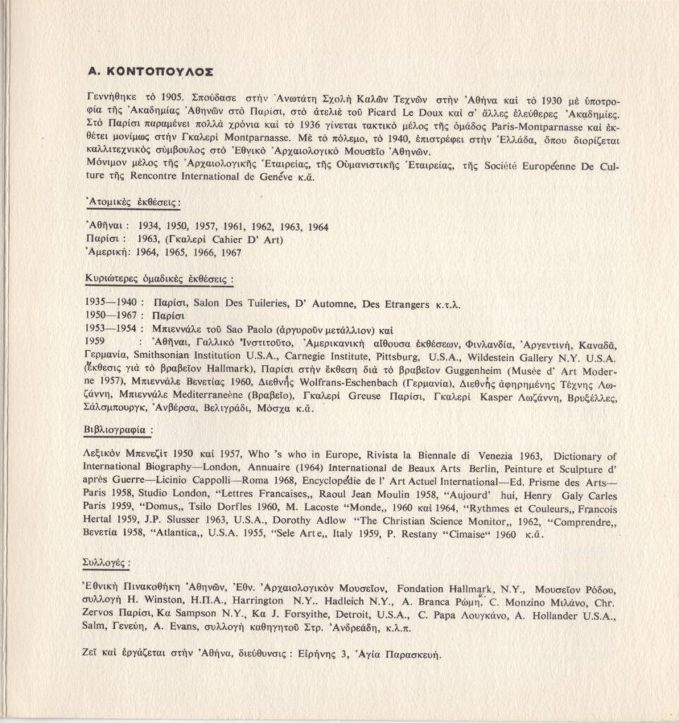 Andreou Kostas (1917 - 2007) ; Fatouros Dimitris (1928 - 2020) ; Spiteri-Veropoulou Ioanna (1920 - 2000) ; Eugène Delacroix (1798 - 1863) ; Touyas Giorgos (1922 - 1994) ; Simossi Gabriela (1926 - 1999) ; Tsoclis Costas (1930) ; Sklavos Yerassimos (1927 - 1967) ; Άγγελος Αγγελόπουλος (1904 - 1995) ; Kontopoulos Alekos (1904 - 1975) ; Mylonas Alex (1923 - 2016) ; Vyzantios Ntikos (1924 - 2007) ; Berto Lardera ; Valsamis Kostas (1908 - 2003) ; Gaitis Yannis (1923 - 1984) ; Le Corbusier (1887 - 1965) ; Georges Mathieu (1921 - 2012) ; Theodoros (Papadimitriou) (1931 - 2018) ; Takis (Vassilakis Panayiotis) (1925 - 2019) ; Victor Vasarely ; Philolaos (Tloupas) (1923 - 2010) ; Kessanlis Nikos (1930 - 2004) ; Kriezi Tita (1930 - 2021) ; Lyberaki Aglaia (1923 - 1985) ; Maltezos Yannis (1915 - 1987) ; Molfesis Iasson (1925 - 2009) ; Paniaras Kostas (1934 - 2014) ; Karras Kostas (1936 - 2012) ; Γιώργος Βαφειάδης