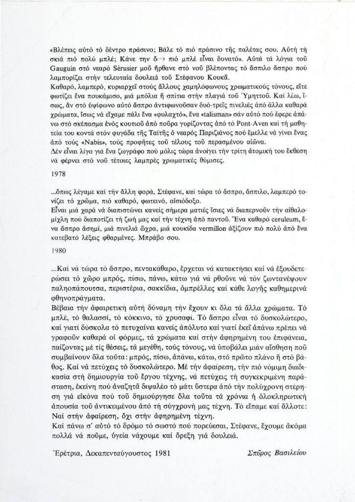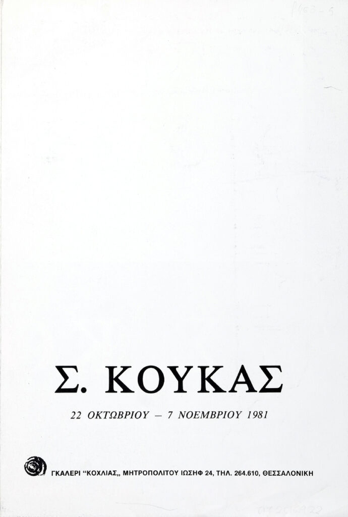 Poster for Stefanos Koukas’ solo painting exhibition in Thessaloniki in 1981. The reverse features a biographical note and a text by the artist, along with contributions by Sp. Vassiliou and D. Iliopoulou-Rogan.