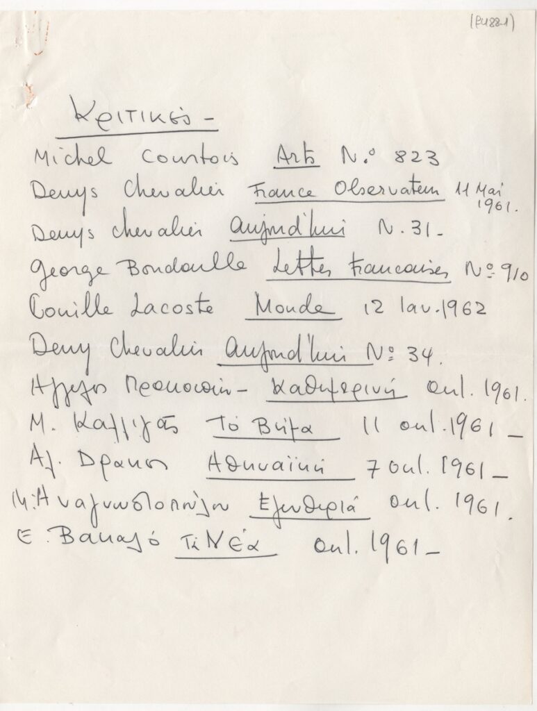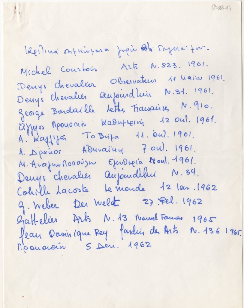 Andreou Kostas (1917 - 2007) ; Fatouros Dimitris (1928 - 2020) ; Spiteri-Veropoulou Ioanna (1920 - 2000) ; Eugène Delacroix (1798 - 1863) ; Touyas Giorgos (1922 - 1994) ; Simossi Gabriela (1926 - 1999) ; Tsoclis Costas (1930) ; Sklavos Yerassimos (1927 - 1967) ; Άγγελος Αγγελόπουλος (1904 - 1995) ; Kontopoulos Alekos (1904 - 1975) ; Mylonas Alex (1923 - 2016) ; Vyzantios Ntikos (1924 - 2007) ; Berto Lardera ; Valsamis Kostas (1908 - 2003) ; Gaitis Yannis (1923 - 1984) ; Le Corbusier (1887 - 1965) ; Georges Mathieu (1921 - 2012) ; Theodoros (Papadimitriou) (1931 - 2018) ; Takis (Vassilakis Panayiotis) (1925 - 2019) ; Victor Vasarely ; Philolaos (Tloupas) (1923 - 2010) ; Kessanlis Nikos (1930 - 2004) ; Kriezi Tita (1930 - 2021) ; Lyberaki Aglaia (1923 - 1985) ; Maltezos Yannis (1915 - 1987) ; Molfesis Iasson (1925 - 2009) ; Paniaras Kostas (1934 - 2014) ; Karras Kostas (1936 - 2012) ; Γιώργος Βαφειάδης