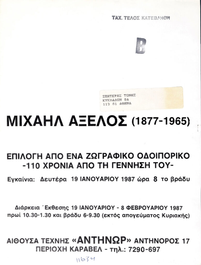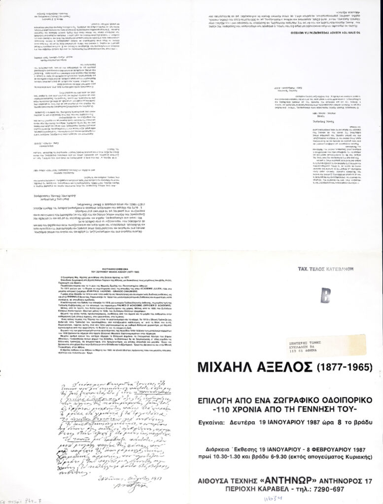 Poster for the retrospective exhibition of Michael Axelos, at the Antinor Art Gallery in Athens.