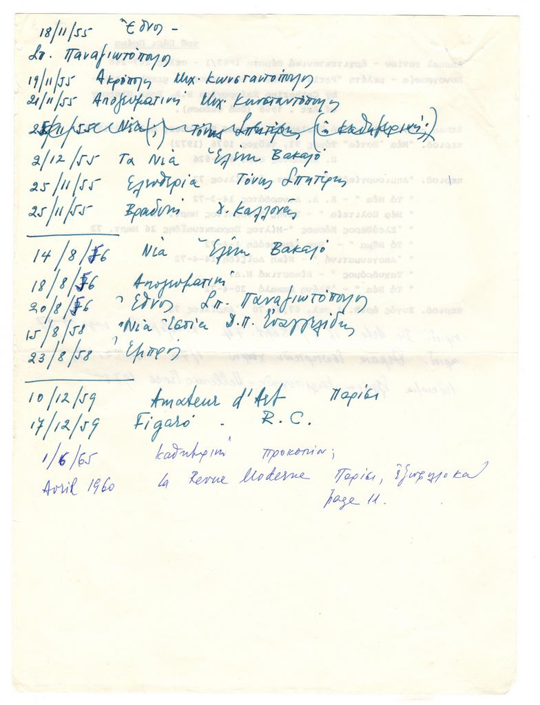 Stathopoulou Eleni (1914 - 2016) ; Nikos Engonopoulos (1907 - 1985) ; Vassiliou Spyros (1902 - 1985) ; Marthas Takis (1905 - 1965) ; Eleni Vakalo (1921 - 2001) ; Eleni Zongolopoulou (1909 - 1993) ; Fassianos Alekos (1935 - 2022) ; Migadis Yannis (1926 - 2017) ; Tsoclis Costas (1930) ; Γιώργος Κυριάκου (1940) ; Arlioti Lili (1908 - 1979) ; Kontopoulos Alekos (1904 - 1975) ; Vasilis Vasiliadis (1927 - 1991) ; Sperantzas Vassilis (1938) ; Κύριλλος Βενιάδης (1936 - 1995) ; Βασίλης Κυπραίος (1936 - 2021) ; Panayiotis Gravalos (1933 - 2015) ; Τζένη Δρόσου ; Ελένη Ζέρβα (1917 - 1993) ; Άλκης Κανακάκης ; Vlassis Kaniaris (1928 - 2011) ; Kyriaki-Zisopoulou Sapfo (1928) ; Kyritsis Apostolos (1924 - 2022) ; Baharian Asadour (1924 - 1990) ; Maltezos Yannis (1915 - 1987) ; Mytara Charikleia (1935) ; Prekas Paris (1926 - 1999) ; Yannis Svoronos (1919 - 1987) ; Γιάννης Σκουρογιάννης ; Χρυσούλα Ρωξάνη ; Σίμων Καράς ; Γιάννης Κοντός ; Απόστολος Σαχίνης ; Αλίκη Βενιέρη-Σκουλικίδη (1934) ; Τζέννυ Παπαδάκη-Μελισσηνού ; Λάζαρος Ουσταπασίδης