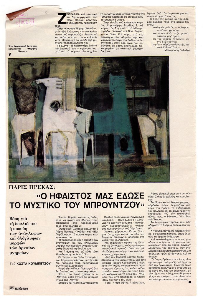 Nikos Engonopoulos (1907 - 1985) ; Semertzidis Valias (1911 - 1983) ; Spiteri-Veropoulou Ioanna (1920 - 2000) ; Vassiliou Spyros (1902 - 1985) ; Hatzikyriakos-Ghika Nikos (1906 - 1994) ; Raftopoulou Bella (1902 - 1992) ; Sikeliotis Giorgos (1917 - 1984) ; Iliopoulou-Rogan Dora (20th century) ; Gaitis Yannis (1923 - 1984) ; Mytaras Dimitris (1934 - 2017) ; Tetsis Panagiotis (1925 - 2016) ; Panayiotis Gravalos (1933 - 2015) ; Konstantinos Grammatopoulos (1916 - 2003) ; Varlamos Giorgos (1922 - 2013) ; Katsoulidis Takis (1933) ; Μάριος Λοβέρδος ; Malamos Kostas (1913) ; Manousakis Giorgos (1914 - 2003) ; Georgios Mavroidis (1912 - 2003) ; Malamou-Mitsea Ioanna (1913 - 2004) ; Preka-Stefanatou Meropi (1934 - 2025) ; Prekas Paris (1926 - 1999) ; Ευάγγελος Τερζόπουλος ; Iris Drakouli (1929)