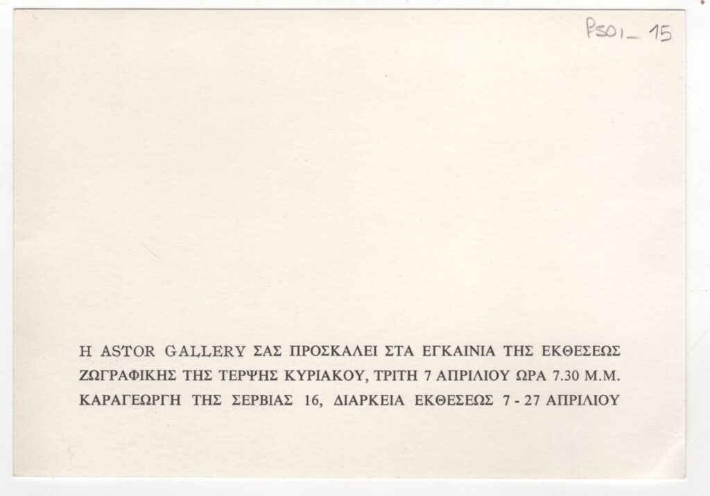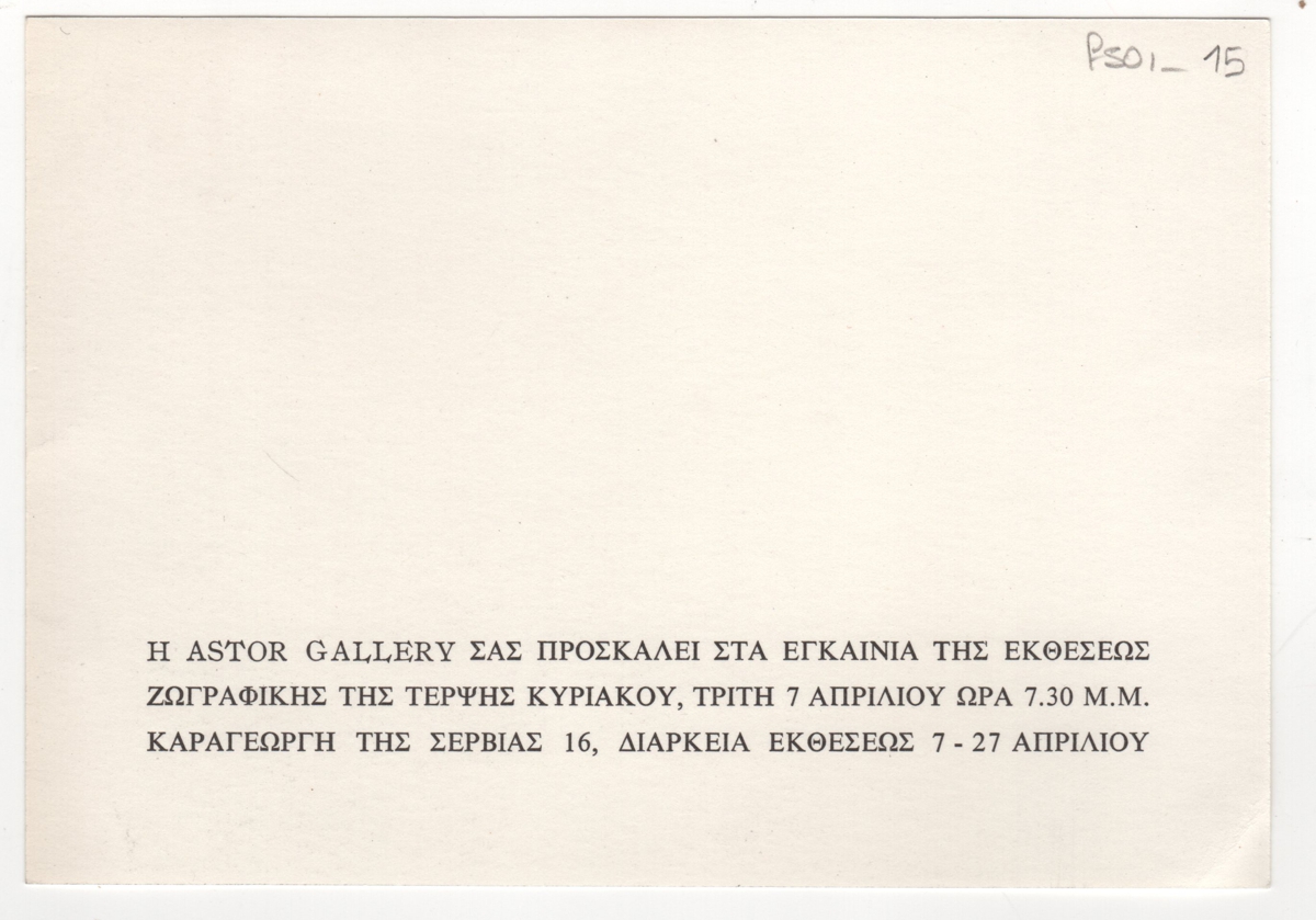 Spiteri-Veropoulou Ioanna (1920 - 2000) ; Vassiliou Spyros (1902 - 1985) ; Michalis Tompros (1889 - 1974) ; Rene Deroudille ; Τέρψη Κυριακού (1916 - 1993) ; Tsoclis Costas (1930) ; Sklavos Yerassimos (1927 - 1967) ; Mylonas Alex (1923 - 2016) ; Gaitis Yannis (1923 - 1984) ; Karas Christos (1930 - 2023) ; Francis Bacon (1909 - 1992) ; Villon Jacques (1875 - 1963) ; Parandinos Nikolaos (1910 - 1991) ; Alberto Burri (1915 - 1995) ; Μανώλης Πιλαδάκης (1927) ; Claude Santa
