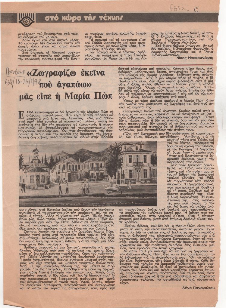 Sikeliotis Giorgos (1917 - 1984) ; Tsarouchis Yannis (1910 - 1989) ; Antonakatou Diana (1922 - 2011) ; Vakalo Giorgos (1902 - 1991) ; Katsireas Stavrianos (1937) ; Komianou Aria (1938 - 2015) ; Venios Markos (1946) ; Parmakelis Yannis (1932) ; Ρόζα Ηλιού (1930) ; Vasilis Kelaidis (1938) ; Kleopa Thaleia (1928) ; Michelis Effie P. (1906 - 1984) ; Γιώργος Μοσχίδης ; Patrikalakis Faidon (1935 - 2017) ; Maria Pop (1925 - 2009) ; Λυδία Σαρρή (1940) ; Giorgos Stathopoulos (1944) ; Ελένη Παπαδάκη ; Prinopoulou Fofo (20th century) ; Λίζα Μπόταση-Δεληβάνη ; Chatzinas, Dimitris (1929 - 2009) ; Pantelias Miltos (1954) ; Ρόζα Μαρμαρίδου