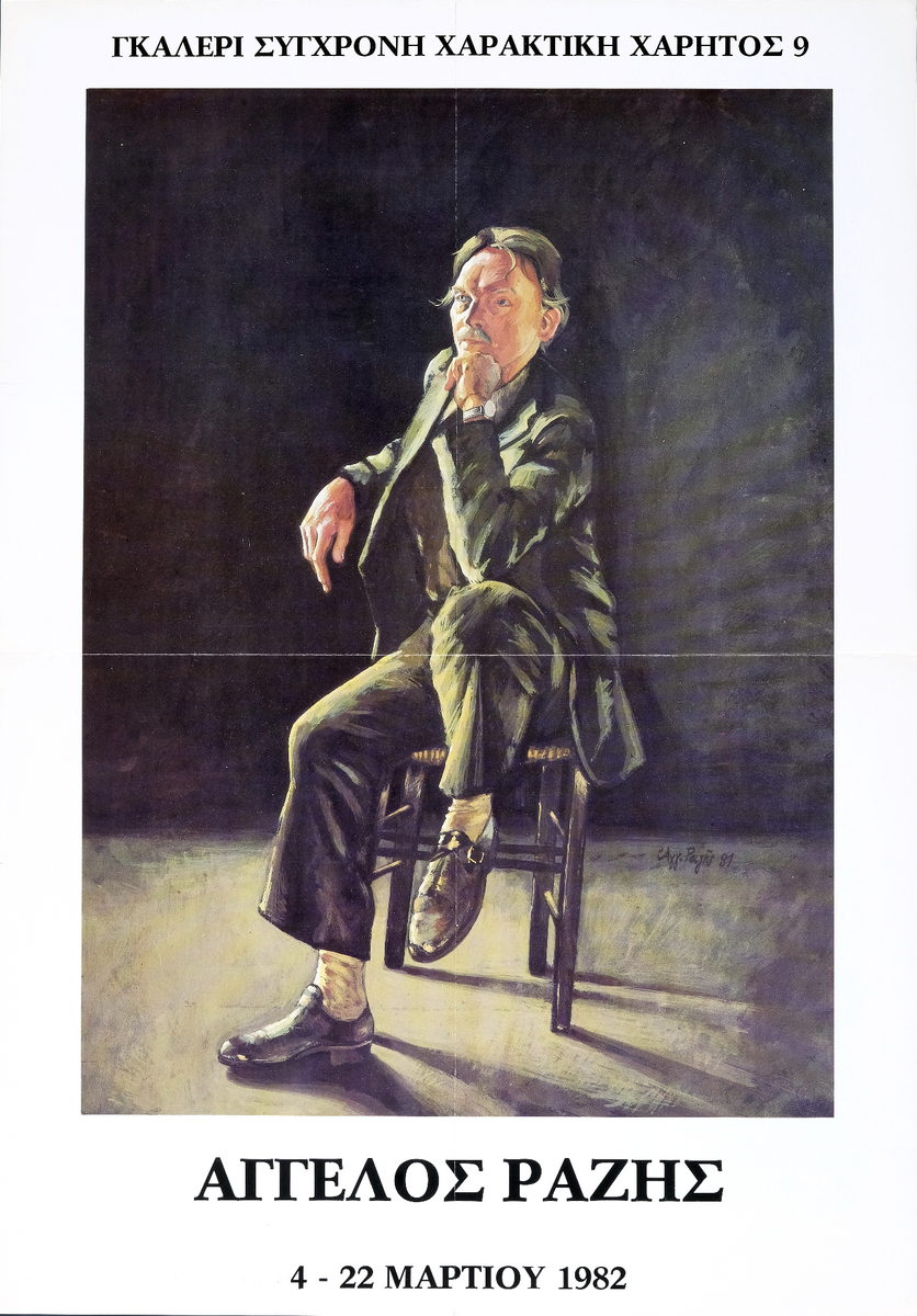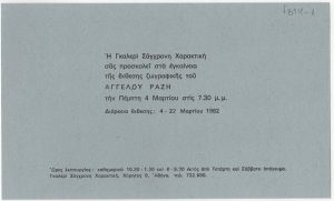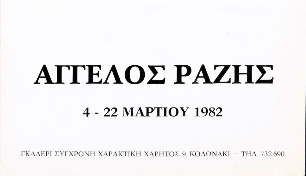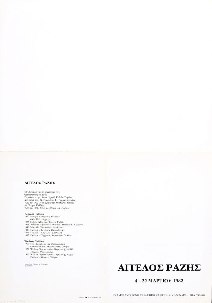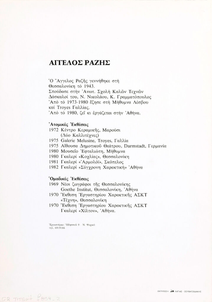 Poster for Angelos Razi’s solo painting exhibition at the “Contemporary Engraving” Gallery in Athens, featuring a biographical note on the artist.