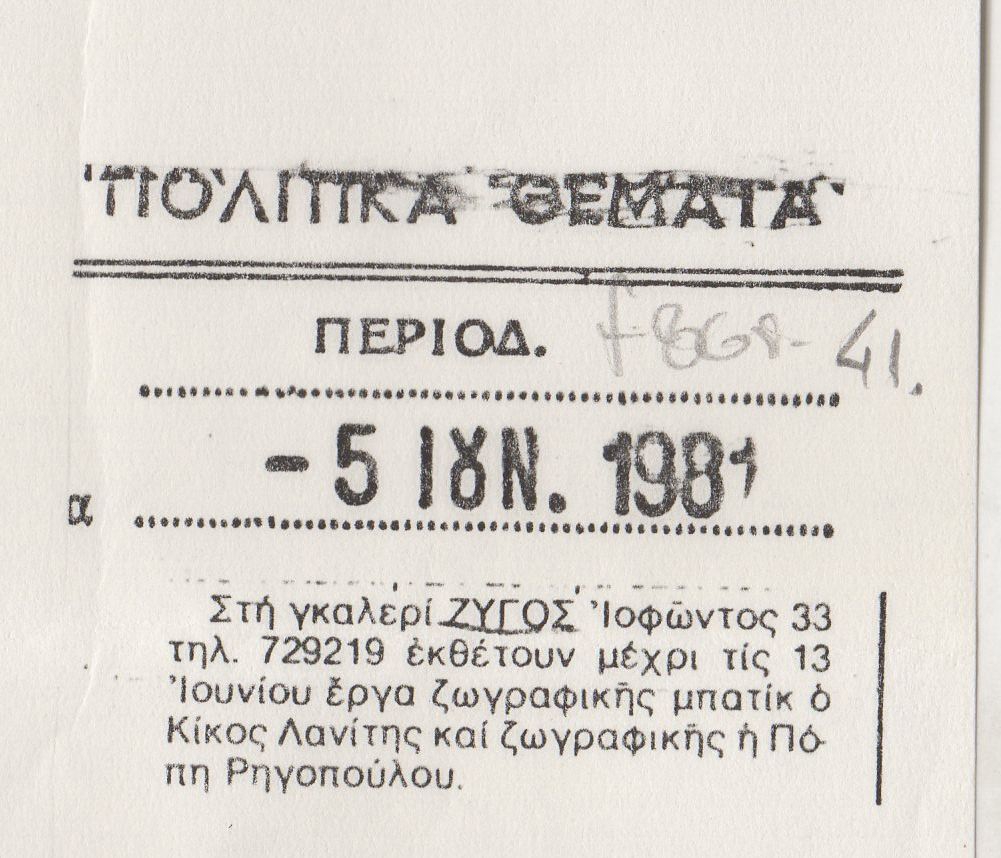 Rigopoulou Pepi ; Léger, Fernand (1881 - 1955) ; Kyritsis Apostolos (1924 - 2022) ; Maltezos Yannis (1915 - 1987) ; Καίτη Μεσσηνέζη-Πλατσή (1940) ; Pantos, Theodoros (1932 - 2013) ; Ioan Tolan ; Chatzinas, Dimitris (1929 - 2009) ; Μάγια Βαλαβανίδη-Wessely (1940) ; Jessie Wood ; Όλγα Βαλιάτζα-Οικονόμου (1943) ; Στέλιος Ζαχαρόπουλος ; Στέφανος Ξανθάκης (1938) ; Στ. Σταύρου