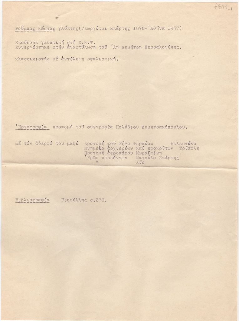Michalis Tompros (1889 - 1974) ; Vroutos Georgios (1843 - 1909) ; Sochos Antonios (1888 - 1975) ; Thomas Thomopoulos (1873 - 1937) ; Γεώργιος ο Αθηναίος Δημητριάδης (1880 - 1941) ; Γεώργιος Αλεξανδρόπουλος (1889 - 1942) ; Dimitriadis Konstantinos (1881 - 1943) ; Zevgolis Grigorios (1886 - 1950) ; Ιωάννης Κόσσος ; Σταμάτης Παρλιάρος ; Κώστας Ρούμπος ; Πέτρος Ρούμπος ; Γεώργιος Συννέφας ; Korais Adamantios (1748 - 1833) ; George I, King of the Greeks (1845 - 1913) ; Canova, Antonio (1757 - 1822) ; Giulio Tadolini ; Νικόλαος Γεωργαντής