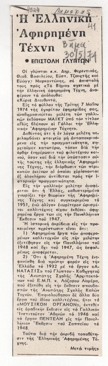 Spiteri-Veropoulou Ioanna (1920 - 2000) ; Perdikidis Dimitris (1922 - 1989) ; Τέρψη Κυριακού (1916 - 1993) ; Phidias (5th century BC) ; Sklavos Gerasimos (1927 - 1967) ; Lameras Lazaros (1913 - 1998) ; Exarchopoulos, Thanasis (1927 - 2021) ; Ελένη Ζέρβα (1917 - 1993) ; Μανώλης Πιλαδάκης (1927)