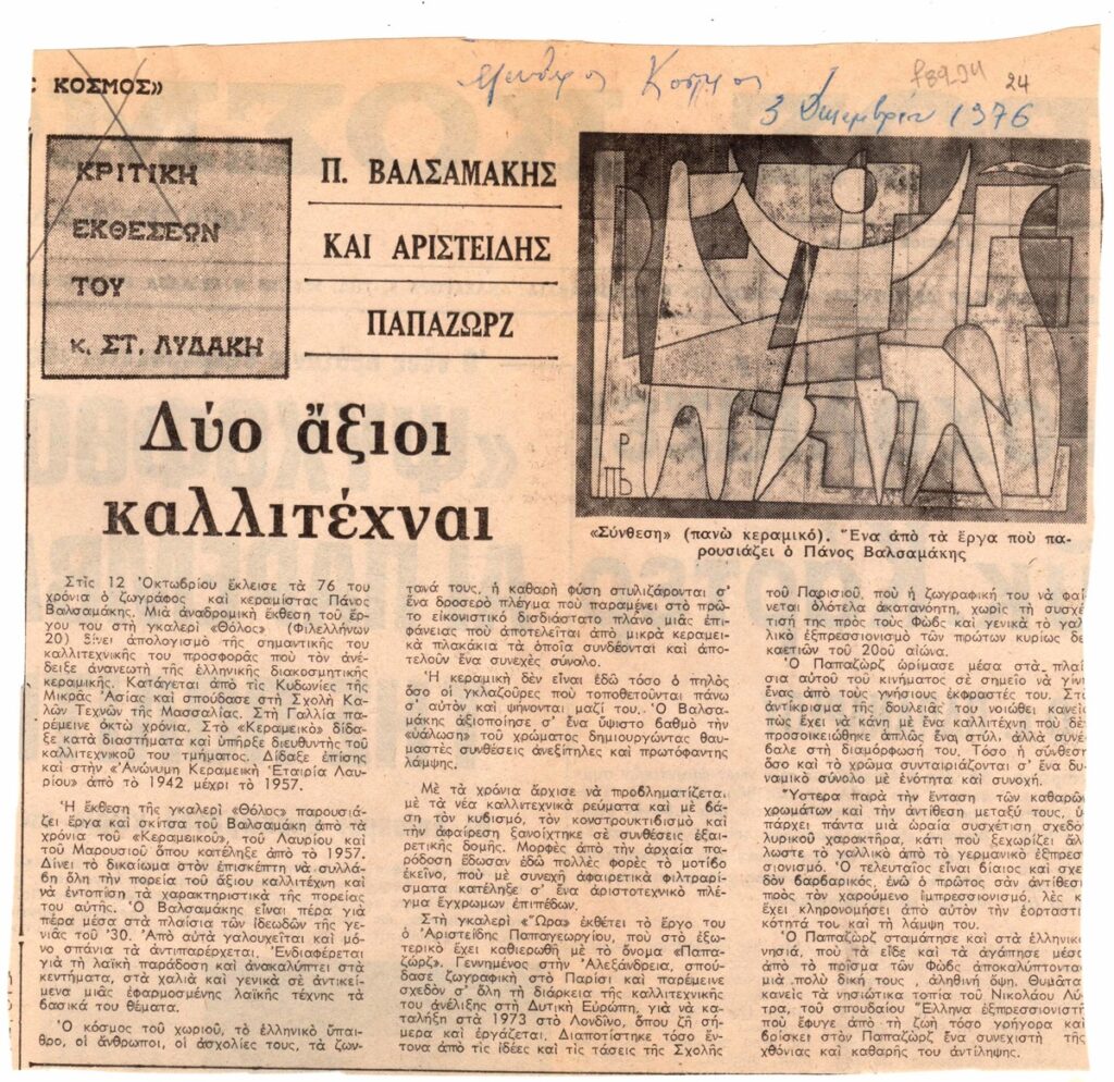 A clipping from the newspaper “Eleftheros Cosmos”, dated December 3, 1976, featuring a revew on the exhibitions of P. Valsamakis and Ar. Papageorge at the Tholos’ Gallery and at the “Ora” Art and Culture Center respectively.
