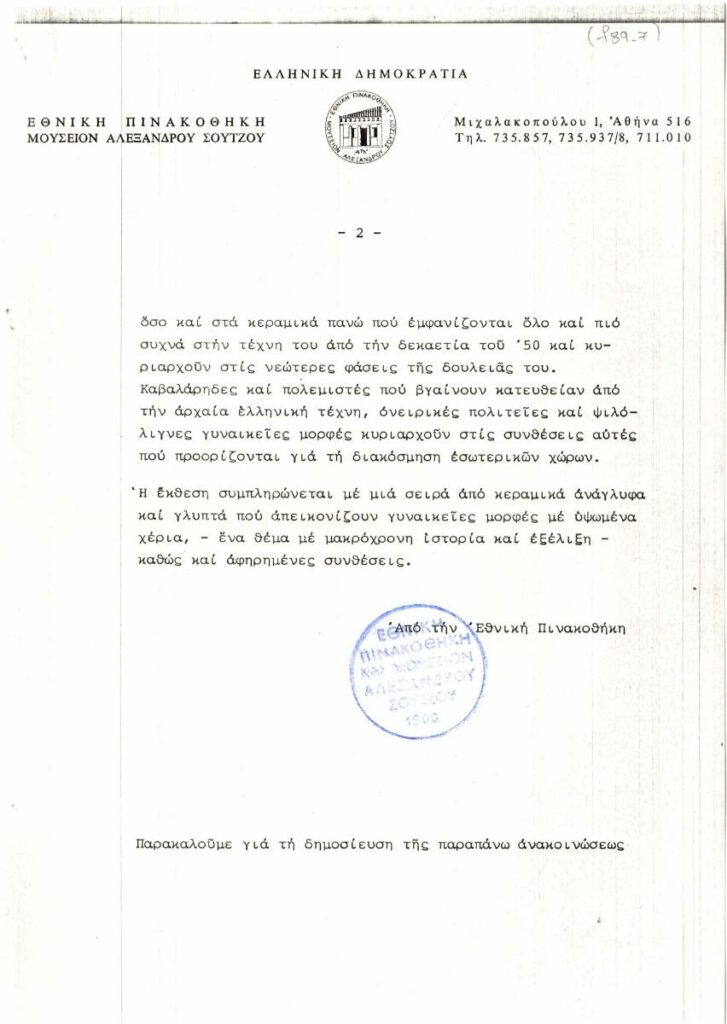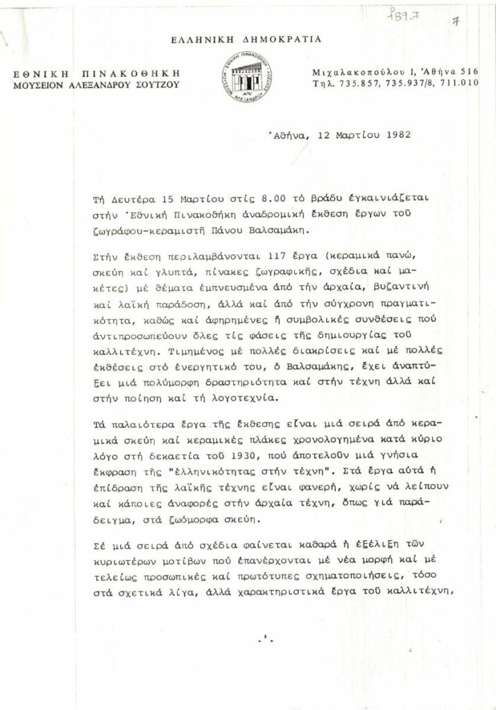 Photocopy of a press release for the retrospective exhibition of Panos Valsamakis at the National Gallery in Athens.