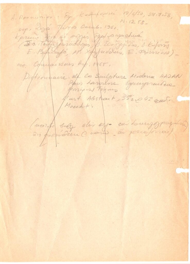 Andreou Kostas (1917 - 2007) ; Spiteri-Veropoulou Ioanna (1920 - 2000) ; Huyghe René (1906 - 1997) ; Raftopoulou Bella (1902 - 1992) ; Achilleas Aperghis (1909 - 1986) ; Mylonas Alex (1923 - 2016) ; Koulentianos Kostas (1918 - 1995) ; Takis (Vassilakis Panayiotis) (1925 - 2019) ; Pevsner Antoine ; Lyberaki Aglaia (1923 - 1985) ; Bourdelle Antoine (1861 - 1929) ; Emily Evershed ; Dennis Gilbert ; Hugh Newbury ; Ralph de Saram ; Richard Waterhouse ; Katherine Watson