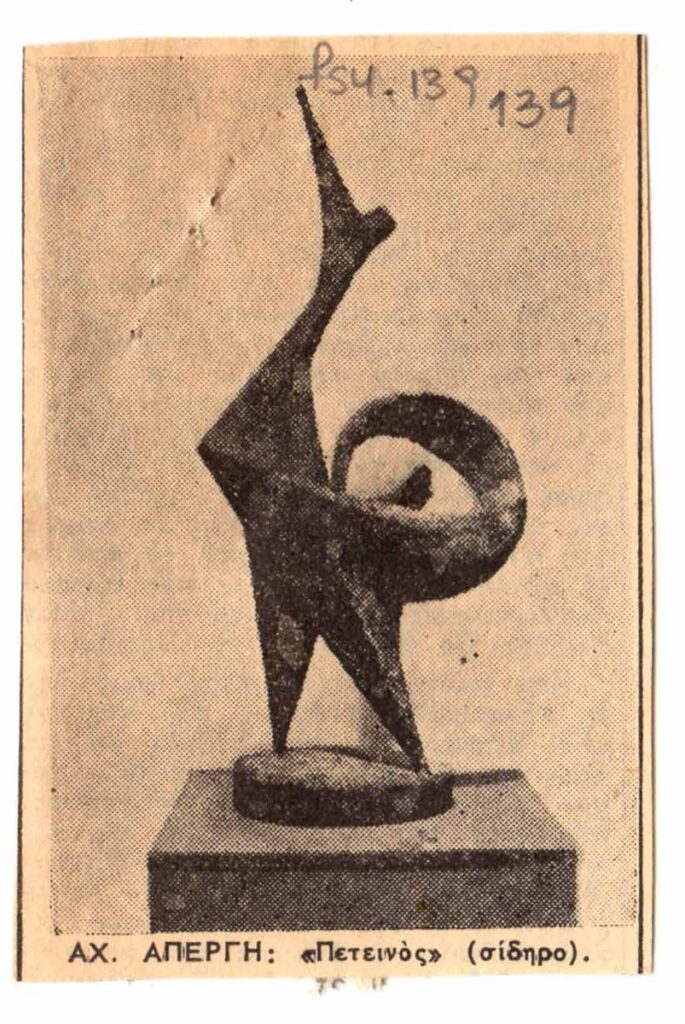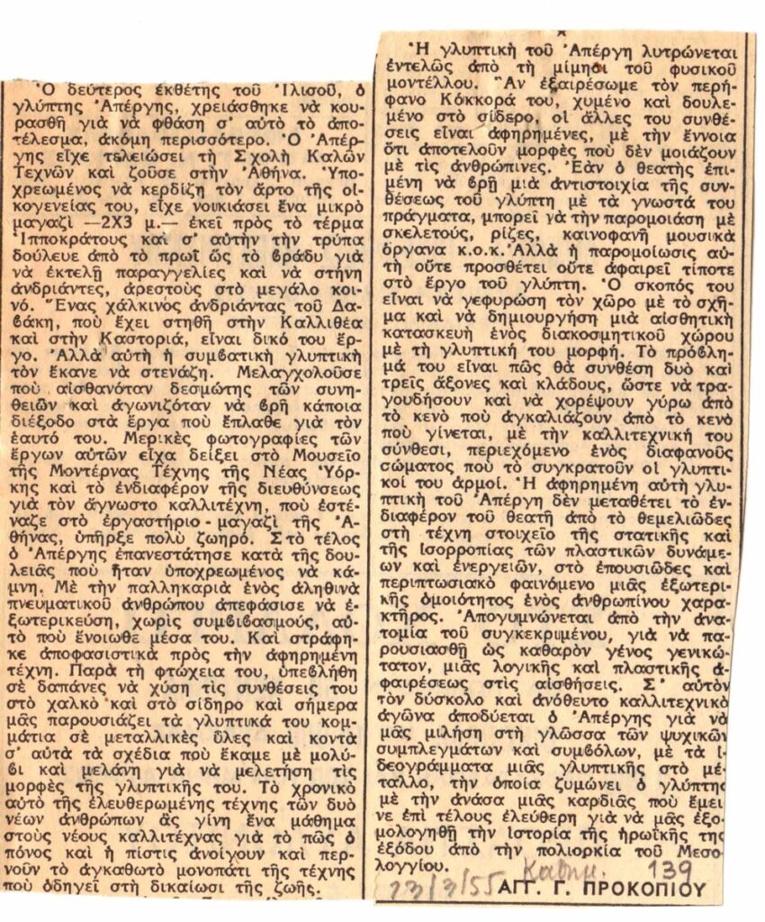 A clipping from the newspaper “I Kathimerini”, dated March 23, 1955, featuring an article about Αchilleas Apergis and his work, on the occasion of his exhibition at the Ilissos gallery.