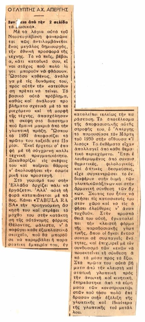 A clipping from the newspaper “Kerkyraika Nea”, featuring an article on Achilleas Apergis and his work.