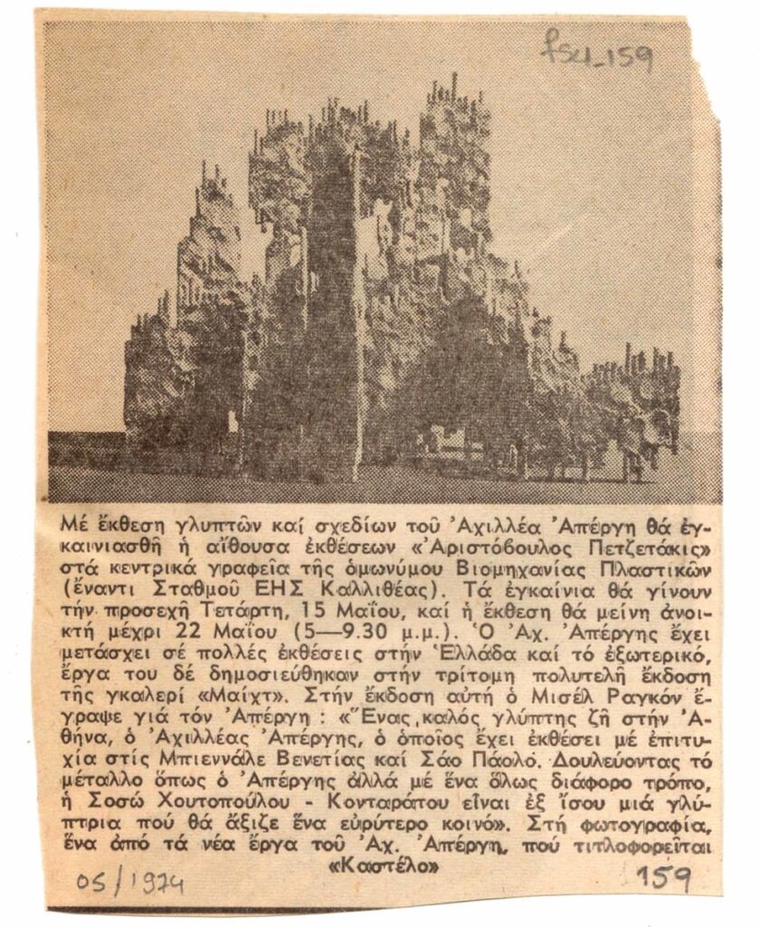 Newspaper clipping announcing the exhibition of Achilleas Apergis at the “Aristoboulos Petzetakis’ exhibition venue in Athens.