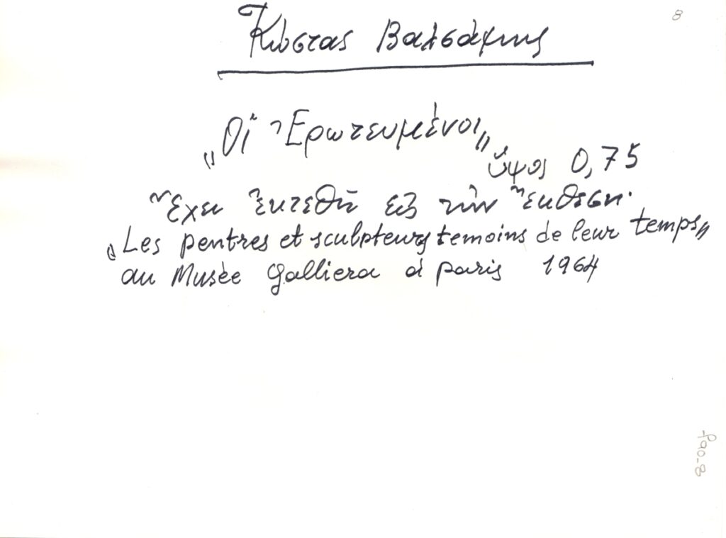 Andreou Kostas (1917 - 2007) ; Fatouros Dimitris (1928 - 2020) ; Spiteri-Veropoulou Ioanna (1920 - 2000) ; Eugène Delacroix (1798 - 1863) ; Touyas Giorgos (1922 - 1994) ; Simossi Gabriela (1926 - 1999) ; Tsoclis Costas (1930) ; Sklavos Yerassimos (1927 - 1967) ; Άγγελος Αγγελόπουλος (1904 - 1995) ; Kontopoulos Alekos (1904 - 1975) ; Mylonas Alex (1923 - 2016) ; Vyzantios Ntikos (1924 - 2007) ; Berto Lardera ; Valsamis Kostas (1908 - 2003) ; Gaitis Yannis (1923 - 1984) ; Le Corbusier (1887 - 1965) ; Georges Mathieu (1921 - 2012) ; Theodoros (Papadimitriou) (1931 - 2018) ; Takis (Vassilakis Panayiotis) (1925 - 2019) ; Victor Vasarely ; Philolaos (Tloupas) (1923 - 2010) ; Kessanlis Nikos (1930 - 2004) ; Kriezi Tita (1930 - 2021) ; Lyberaki Aglaia (1923 - 1985) ; Maltezos Yannis (1915 - 1987) ; Molfesis Iasson (1925 - 2009) ; Paniaras Kostas (1934 - 2014) ; Karras Kostas (1936 - 2012) ; Γιώργος Βαφειάδης