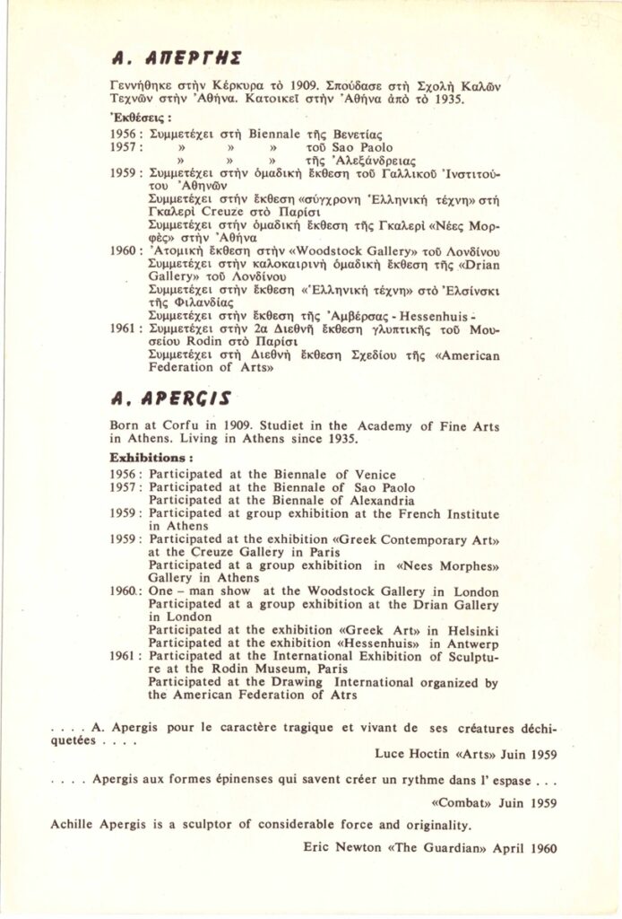 Andreou Kostas (1917 - 2007) ; Spiteri-Veropoulou Ioanna (1920 - 2000) ; Huyghe René (1906 - 1997) ; Raftopoulou Bella (1902 - 1992) ; Aperghis Achilleas (1909 - 1986) ; Mylonas Alex (1923 - 2016) ; Koulentianos Kostas (1918 - 1995) ; Takis (Vassilakis Panayiotis) (1925 - 2019) ; Pevsner Antoine ; Lyberaki Aglaia (1923 - 1985) ; Bourdelle Antoine (1861 - 1929) ; Emily Evershed ; Dennis Gilbert ; Hugh Newbury ; Ralph de Saram ; Richard Waterhouse ; Katherine Watson