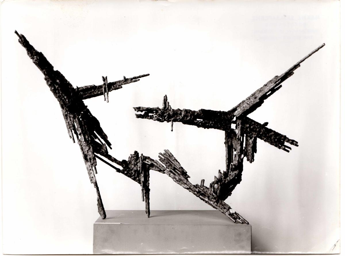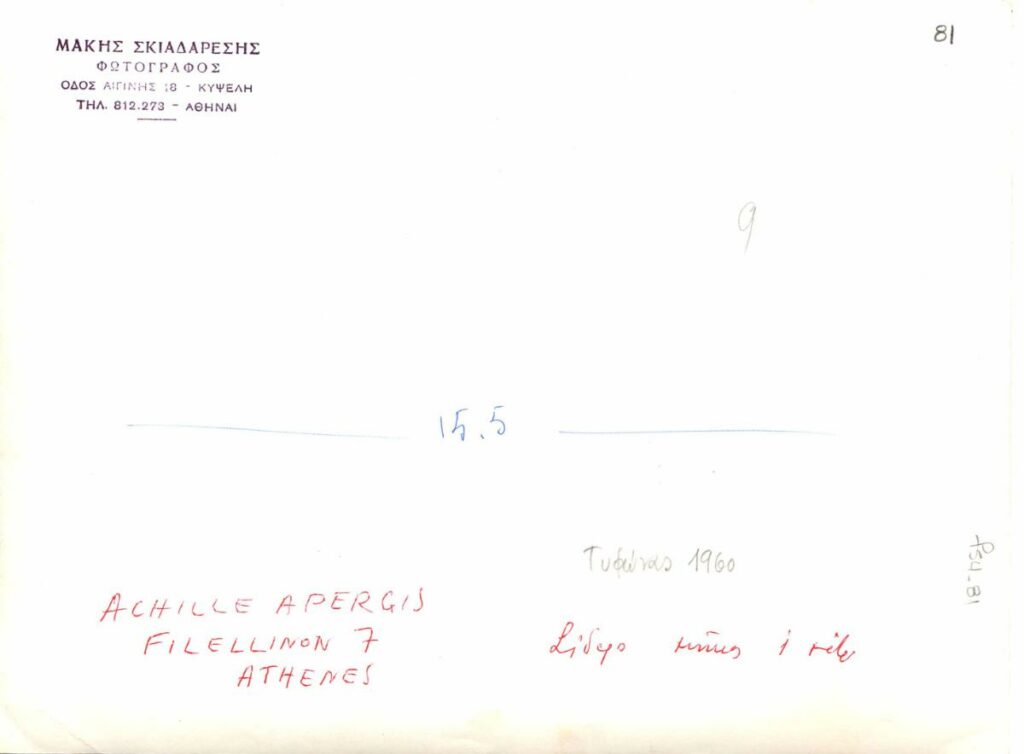 Black-and-white printed photograph of an artwork by Achilleas Apergis, with handwritten inscriptions on the reverse.