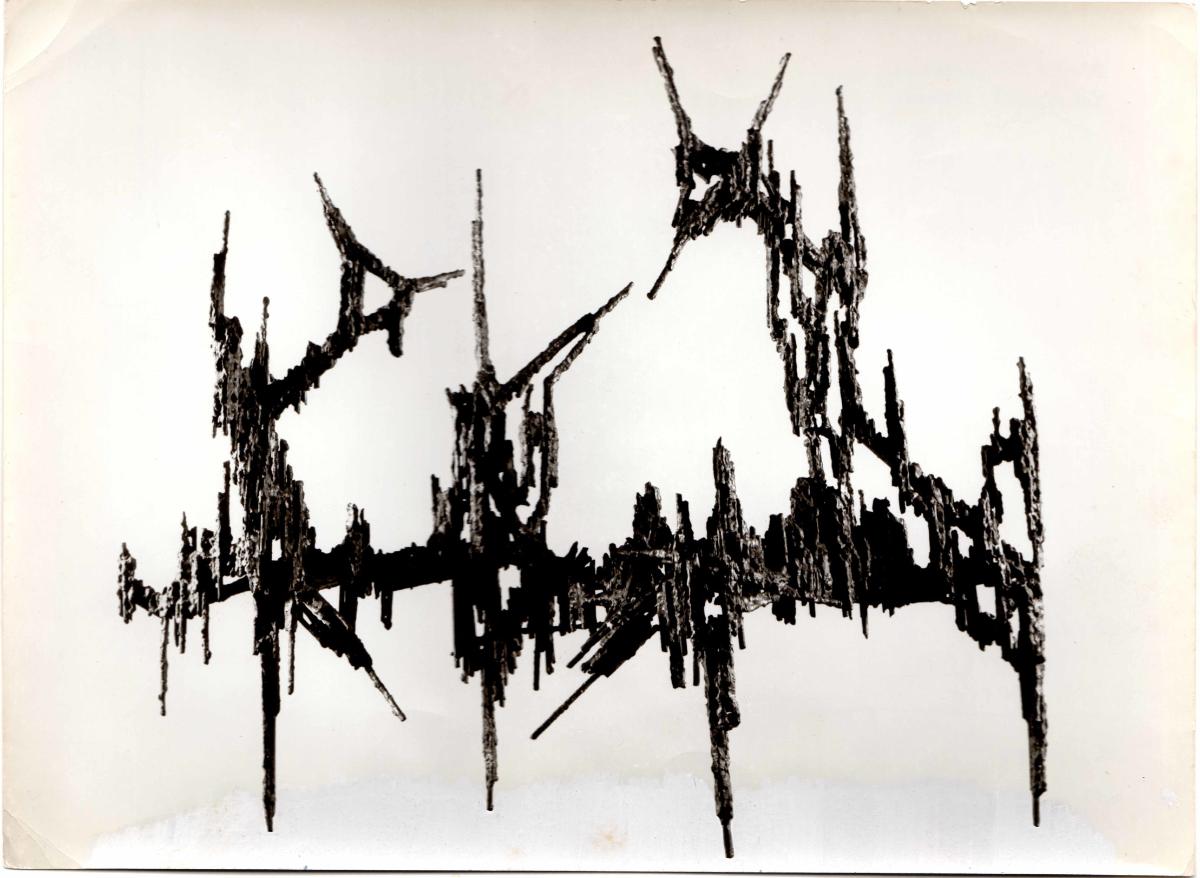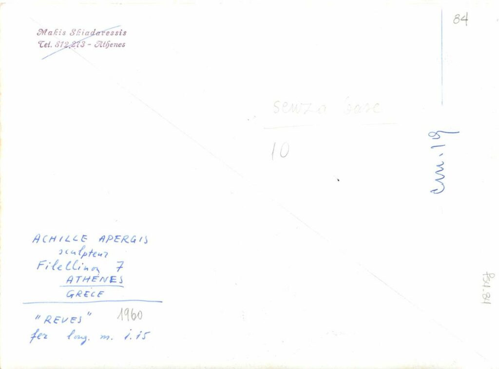 Black-and-white printed photograph of an artwork by Achilleas Apergis, with handwritten inscriptions on the reverse.