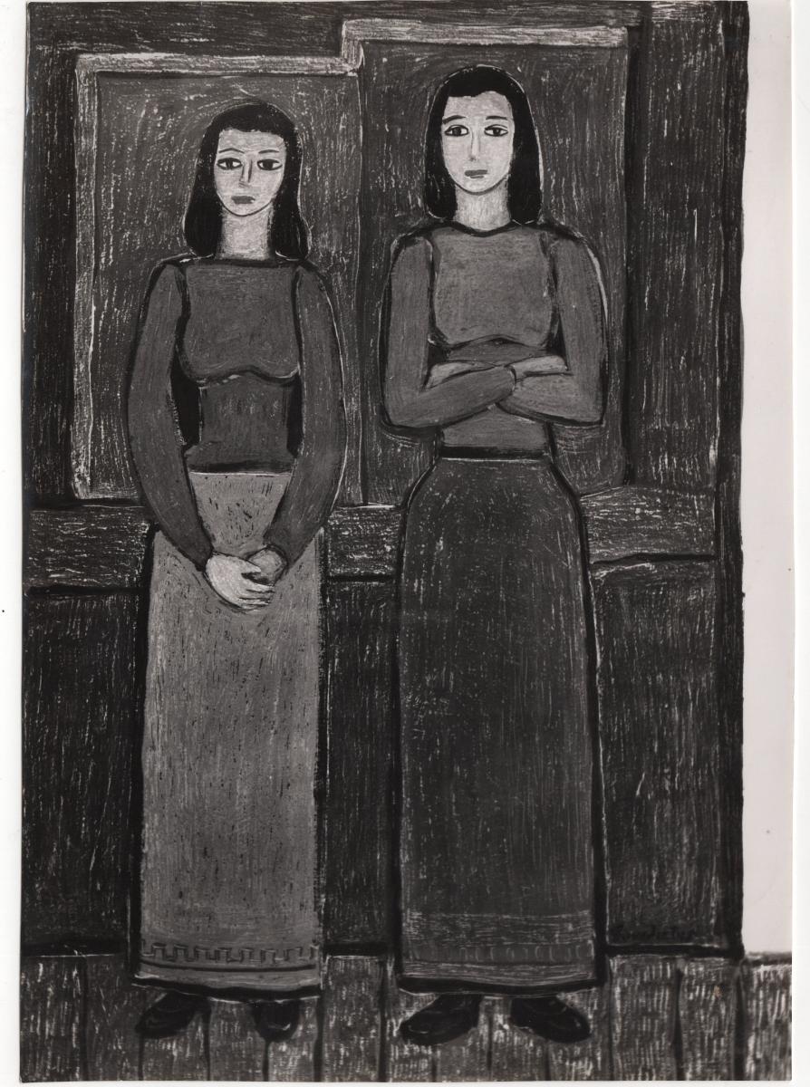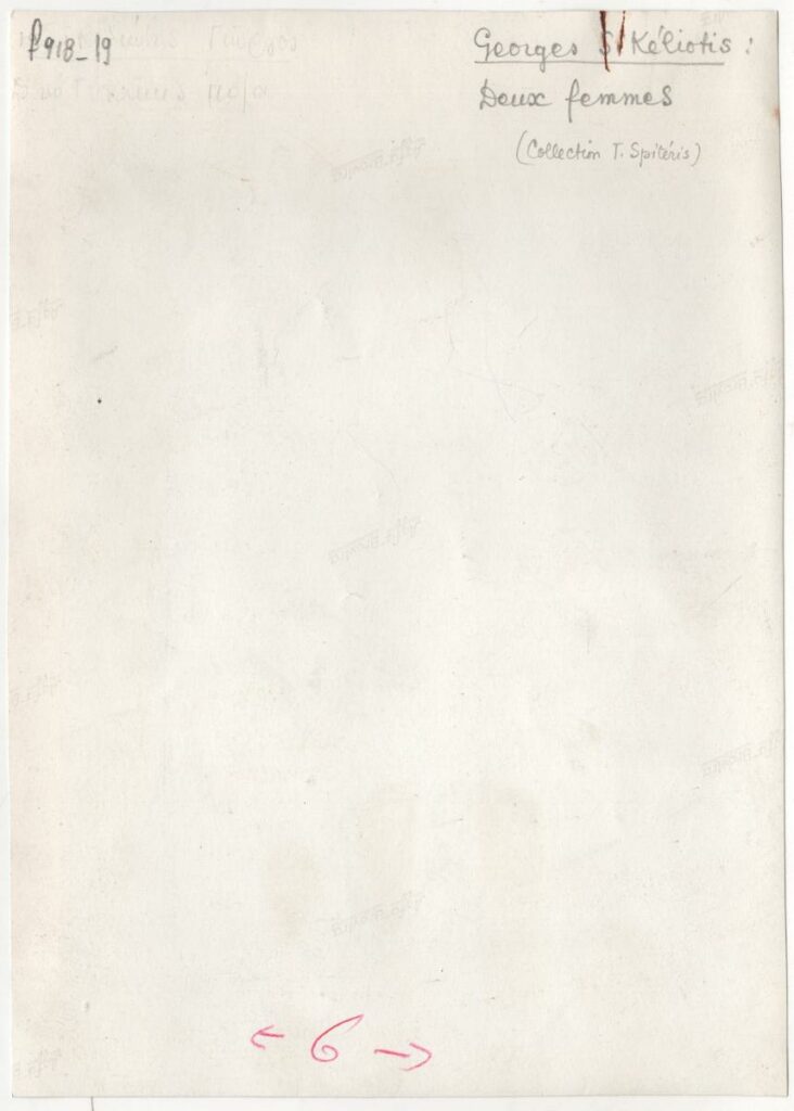 Black-and-white printed photograph of an artwork by Giorgos Sikeliotis. On the reverse, an inscription stating that the artwork belongs to the Tonis Spiteris Collection.