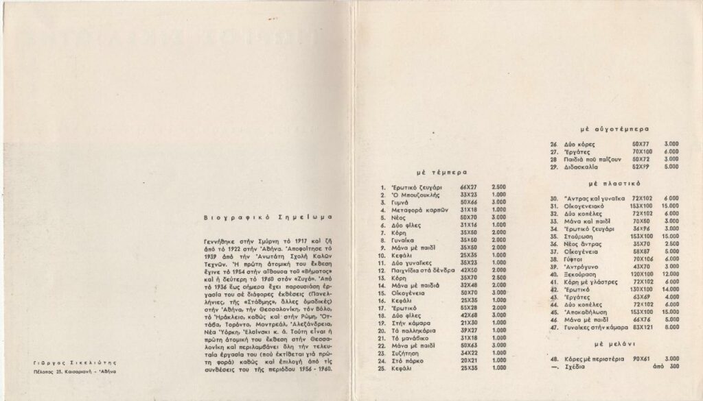 Pamphlet of the solo painting exhibition by Giorgos Sikeliotis at “Techni” Macedonian Artistic Society in Thessaloniki in 1961. It contains artist biographical note and price list of works.