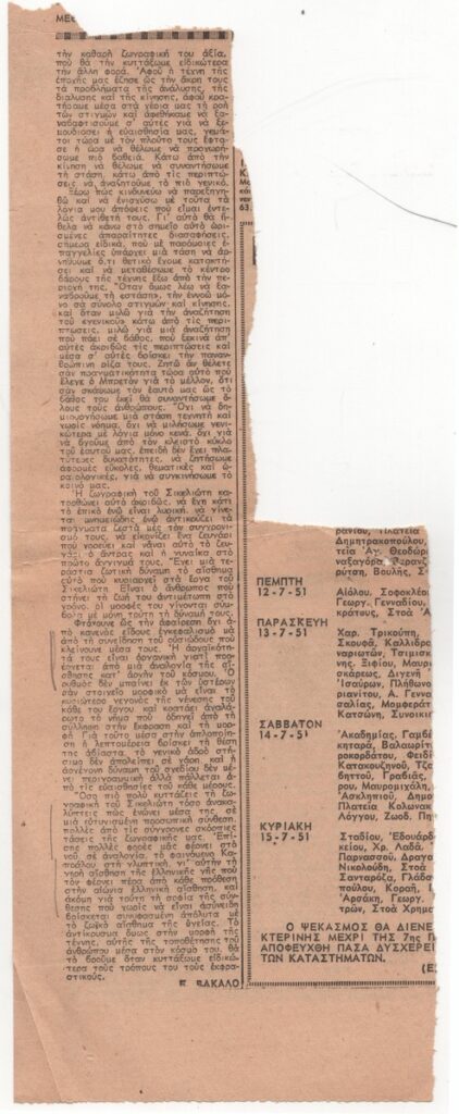 A clipping from the newspaper “Ta Nea”, dated July 7, 1951 featuring a review of the work of Giorgos Sikeliotis.