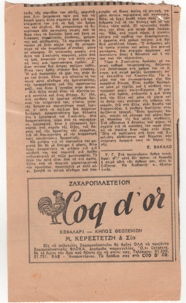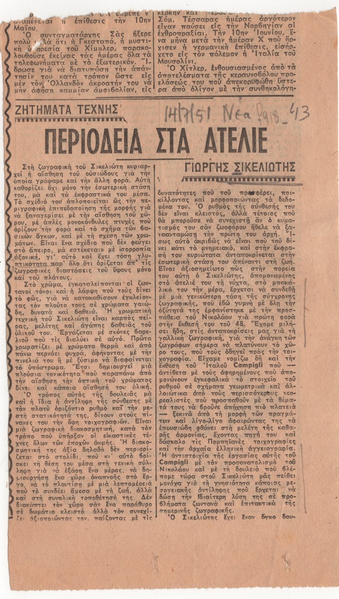 A clipping from the newspaper “Ta Nea”, dated July 14, 1951, featuring review of the work of Giorgos Sikeliotis.