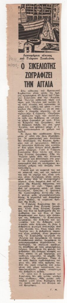 A newspaper clipping, featuring a review of the solo exhibition by Giorgos Sikeliotis with the general title “Old England” in Athens.