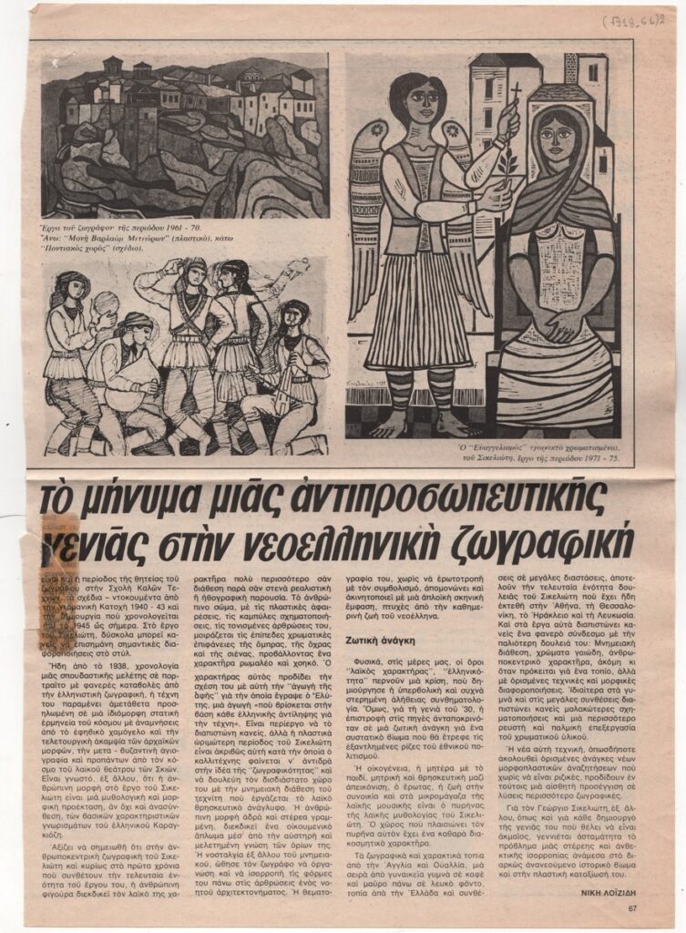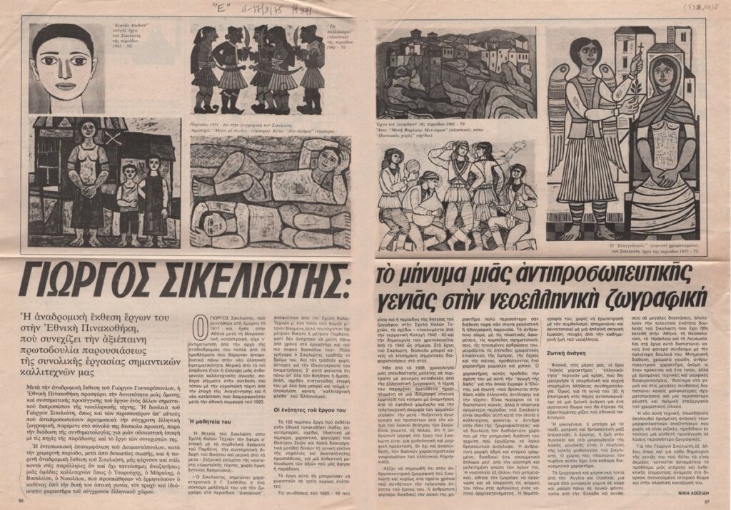 A clipping from the magazine “Epikaira”, dated April 4, 1975, featuring an article on the painter Giorgos Sikeliotis on the occasion of the retrospective exhibition of his works at the National Gallery in Athens in 1975.