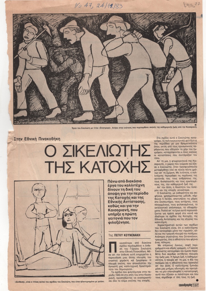 A clipping from the magazine “O Taxydromos”, dated November 24, 1983, featuring a review for the retrospective exhibition of Giorgos Sikeliotis’s drawings from the Occupation and the National Resistance period, held in Athens.