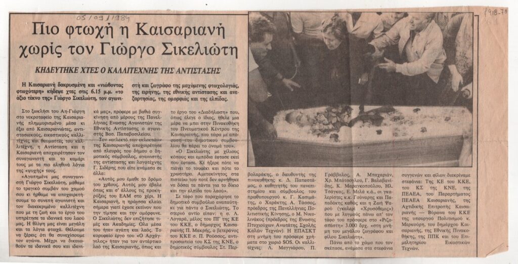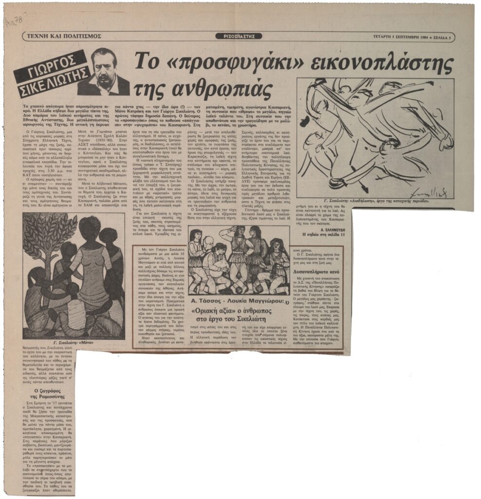 A clipping from the newspaper “Rizospastis”, dated September 5, 1984, featuring a tribute to painter Giorgos Sikeliotis on the occasion of his passing, written by E. Ellinoudi, A. Tassos, and Loukia Maggiorou. The second clipping contains a report from the artist’s funeral, titled “Kaisariani is Poorer Without Giorgos Sikeliotis: The Resistance Artist Was Buried Yesterday”.