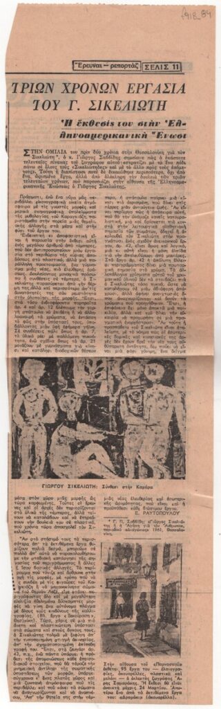 A newspaper clipping, featuring a review of the solo exhibition by Giorgos Sikeliotis at the exhibition’s venue of the Hellenic-American Association in Athens. In the bottom right, an announcement of the solo exhibition by the painter Aris Samarakis at the “Parnassos’ venue in Athens.