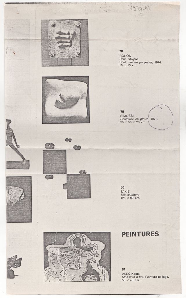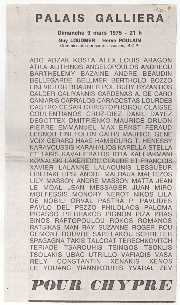 Andreou Kostas (1917 - 2007) ; Fatouros Dimitris (1928 - 2020) ; Spiteri-Veropoulou Ioanna (1920 - 2000) ; Eugène Delacroix (1798 - 1863) ; Touyas Giorgos (1922 - 1994) ; Simossi Gabriela (1926 - 1999) ; Tsoclis Costas (1930) ; Sklavos Yerassimos (1927 - 1967) ; Άγγελος Αγγελόπουλος (1904 - 1995) ; Kontopoulos Alekos (1904 - 1975) ; Mylonas Alex (1923 - 2016) ; Vyzantios Ntikos (1924 - 2007) ; Berto Lardera ; Valsamis Kostas (1908 - 2003) ; Gaitis Yannis (1923 - 1984) ; Le Corbusier (1887 - 1965) ; Georges Mathieu (1921 - 2012) ; Theodoros (Papadimitriou) (1931 - 2018) ; Takis (Vassilakis Panayiotis) (1925 - 2019) ; Victor Vasarely ; Philolaos (Tloupas) (1923 - 2010) ; Kessanlis Nikos (1930 - 2004) ; Kriezi Tita (1930 - 2021) ; Lyberaki Aglaia (1923 - 1985) ; Maltezos Yannis (1915 - 1987) ; Molfesis Iasson (1925 - 2009) ; Paniaras Kostas (1934 - 2014) ; Karras Kostas (1936 - 2012) ; Γιώργος Βαφειάδης
