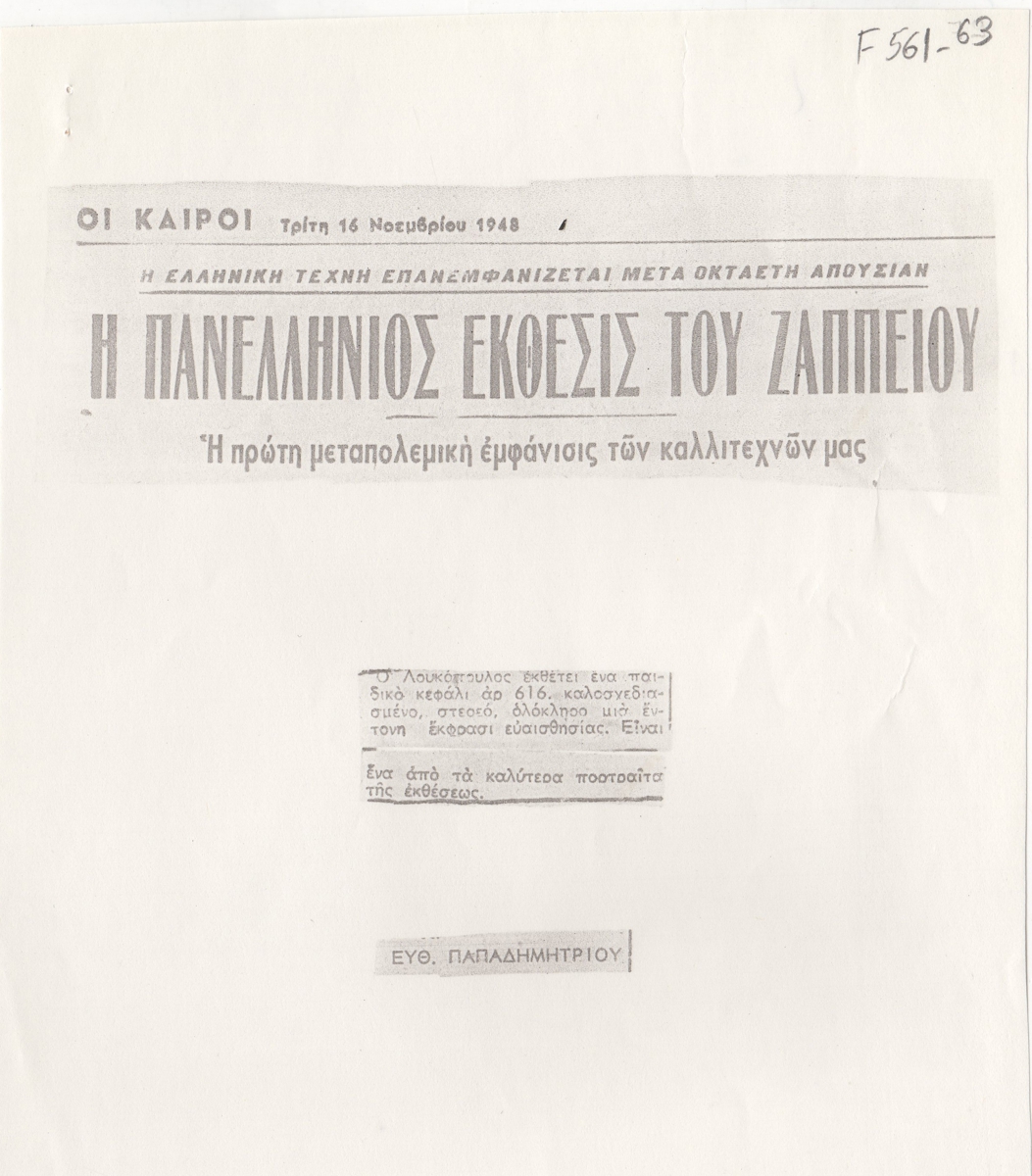 Spiteri-Veropoulou Ioanna (1920 - 2000) ; Andreadi Efi (20th century) ; Touyas Giorgos (1922 - 1994) ; Sorogas Sotiris (1936) ; Διοχάντη (1945) ; Χρύσα Ρωμανού (1931 - 2006) ; Zongopoulos George (1903 - 2004) ; Apergis Achilleas (1909 - 1986) ; Xagoraris, Pandelis (1929 - 2000) ; Dekoulakos Ilias (1929 - 1998) ; Vernadaki Eleni (1933) ; Kanagini, Niki (1933 - 2008) ; Kessanlis Nikos (1930 - 2004) ; Loucopoulos, Clearchos (1906 - 1995) ; Bouteas, Yannis (1941) ; Davou, Bia (1932 - 1996)