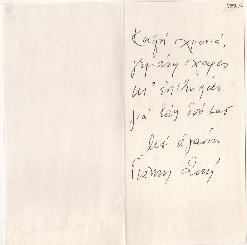Andreou Kostas (1917 - 2007) ; Fatouros Dimitris (1928 - 2020) ; Spiteri-Veropoulou Ioanna (1920 - 2000) ; Eugène Delacroix (1798 - 1863) ; Touyas Giorgos (1922 - 1994) ; Simossi Gabriela (1926 - 1999) ; Tsoclis Costas (1930) ; Sklavos Yerassimos (1927 - 1967) ; Άγγελος Αγγελόπουλος (1904 - 1995) ; Kontopoulos Alekos (1904 - 1975) ; Mylonas Alex (1923 - 2016) ; Vyzantios Ntikos (1924 - 2007) ; Berto Lardera ; Valsamis Kostas (1908 - 2003) ; Gaitis Yannis (1923 - 1984) ; Le Corbusier (1887 - 1965) ; Georges Mathieu (1921 - 2012) ; Theodoros (Papadimitriou) (1931 - 2018) ; Takis (Vassilakis Panayiotis) (1925 - 2019) ; Victor Vasarely ; Philolaos (Tloupas) (1923 - 2010) ; Kessanlis Nikos (1930 - 2004) ; Kriezi Tita (1930 - 2021) ; Lyberaki Aglaia (1923 - 1985) ; Maltezos Yannis (1915 - 1987) ; Molfesis Iasson (1925 - 2009) ; Paniaras Kostas (1934 - 2014) ; Karras Kostas (1936 - 2012) ; Γιώργος Βαφειάδης