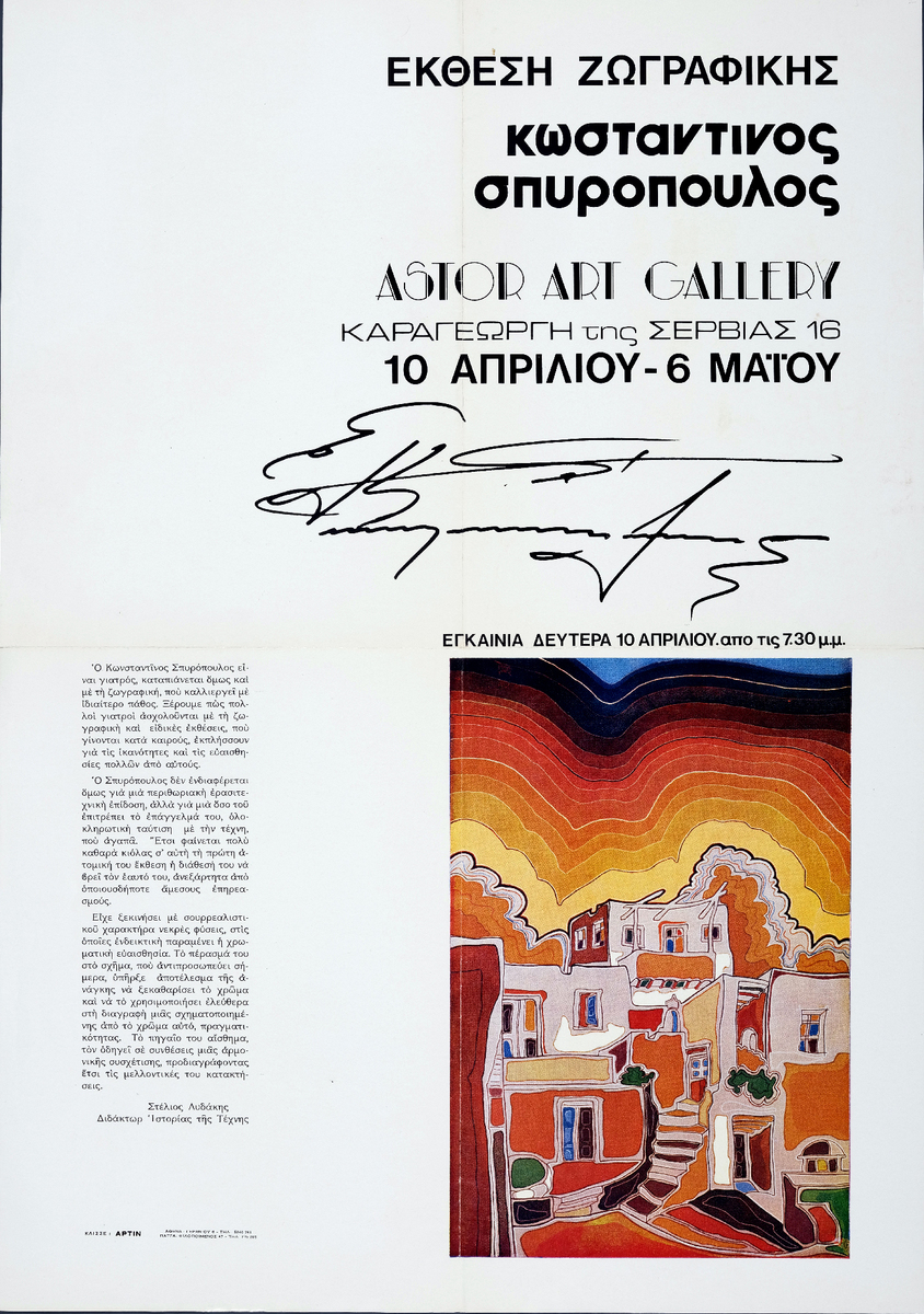 Poster for the solo exhibition by Kostas Spyropoulos at the “Astor Art Gallery” in Athens. It contains a text by the art critic Stelios Lydakis.
