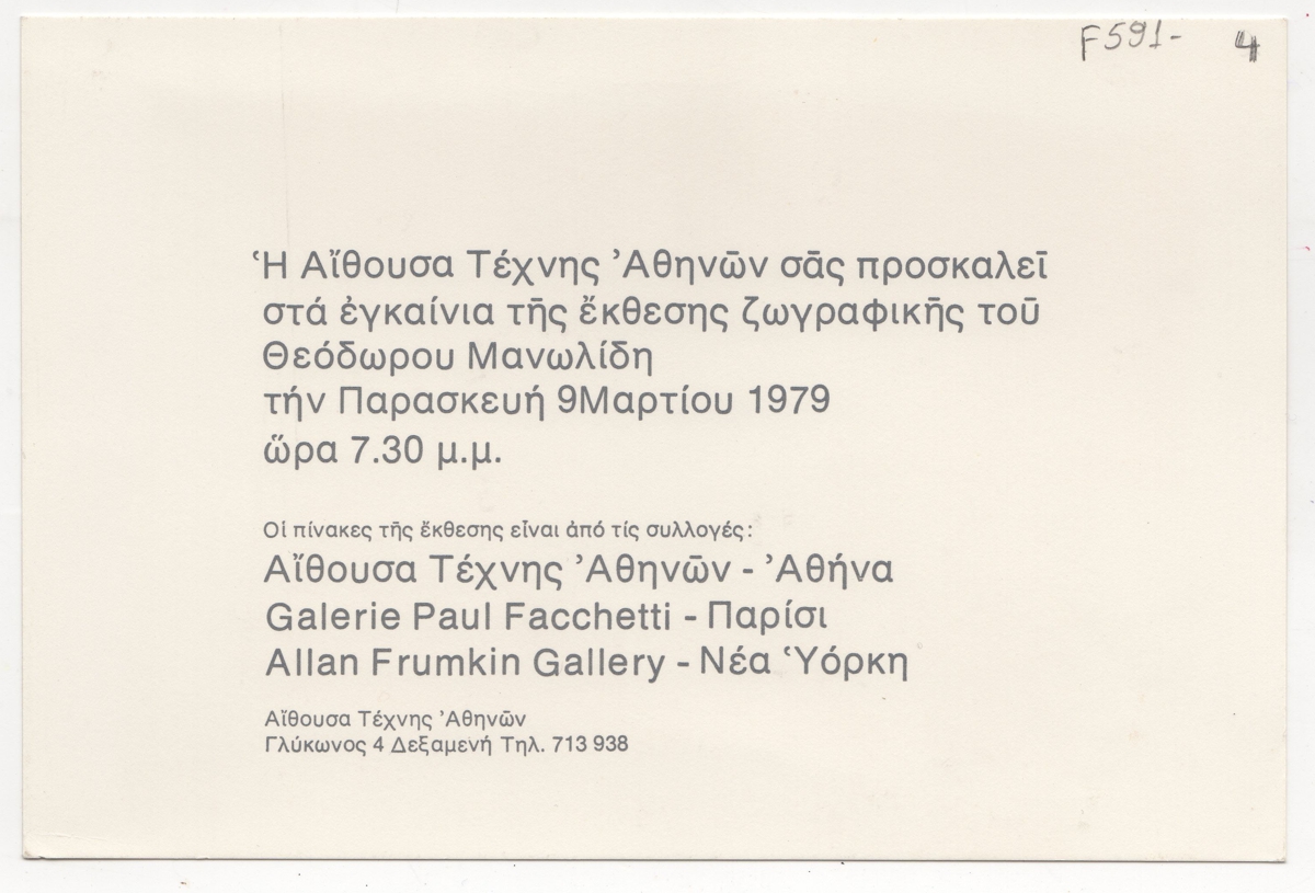 Spiteris Tonis (1910 - 1986) ; Katraki Vaso (1914 - 1988) ; Spiteri-Veropoulou Ioanna (1920 - 2000) ; José Pierre ; Michalis Katzourakis ; Fassianos Alekos (1935 - 2022) ; Simossi Gabriela (1926 - 1999) ; Tsoclis Costas (1930) ; Zouni Opy (1941 - 2008) ; Gaitis Yannis (1923 - 1984) ; Mytaras Dimitris (1934 - 2017) ; Karas Christos (1930 - 2023) ; Denis Schneider ; Vernadaki Eleni (1933) ; Takis (Vassilakis Panayiotis) (1925 - 2019) ; Sperantzas Vassilis (1938) ; Akrithakis Alexis (1939 - 1994) ; Droungas Achilleas (1940) ; Theofylaktopoulos Makis (1939 - 2023) ; Kaniaris Vlassis (1928 - 2011) ; Karavouzis Sarantis (1938 - 2011) ; Θεόδωρος Μανωλίδης (1940)