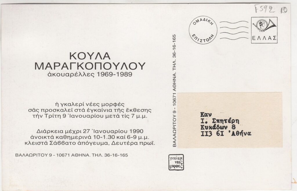 Andreou Kostas (1917 - 2007) ; Fatouros Dimitris (1928 - 2020) ; Spiteri-Veropoulou Ioanna (1920 - 2000) ; Eugène Delacroix (1798 - 1863) ; Touyas Giorgos (1922 - 1994) ; Simossi Gabriela (1926 - 1999) ; Tsoclis Costas (1930) ; Sklavos Yerassimos (1927 - 1967) ; Άγγελος Αγγελόπουλος (1904 - 1995) ; Kontopoulos Alekos (1904 - 1975) ; Mylonas Alex (1923 - 2016) ; Vyzantios Ntikos (1924 - 2007) ; Berto Lardera ; Valsamis Kostas (1908 - 2003) ; Gaitis Yannis (1923 - 1984) ; Le Corbusier (1887 - 1965) ; Georges Mathieu (1921 - 2012) ; Theodoros (Papadimitriou) (1931 - 2018) ; Takis (Vassilakis Panayiotis) (1925 - 2019) ; Victor Vasarely ; Philolaos (Tloupas) (1923 - 2010) ; Kessanlis Nikos (1930 - 2004) ; Kriezi Tita (1930 - 2021) ; Lyberaki Aglaia (1923 - 1985) ; Maltezos Yannis (1915 - 1987) ; Molfesis Iasson (1925 - 2009) ; Paniaras Kostas (1934 - 2014) ; Karras Kostas (1936 - 2012) ; Γιώργος Βαφειάδης