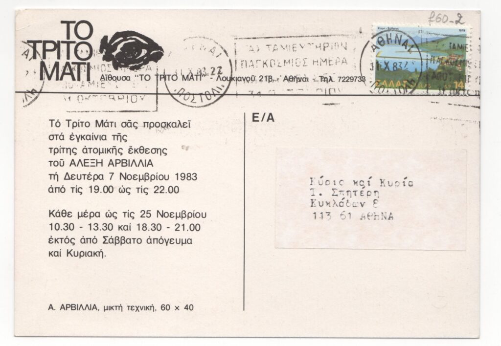Andreou Kostas (1917 - 2007) ; Fatouros Dimitris (1928 - 2020) ; Spiteri-Veropoulou Ioanna (1920 - 2000) ; Eugène Delacroix (1798 - 1863) ; Giorgos Touyas (1922 - 1994) ; Simossi Gabriela (1926 - 1999) ; Tsoclis Costas (1930) ; Sklavos Yerassimos (1927 - 1967) ; Άγγελος Αγγελόπουλος (1904 - 1995) ; Kontopoulos Alekos (1904 - 1975) ; Mylonas Alex (1923 - 2016) ; Vyzantios Ntikos (1924 - 2007) ; Berto Lardera ; Valsamis Kostas (1908 - 2003) ; Gaitis Yannis (1923 - 1984) ; Le Corbusier (1887 - 1965) ; Georges Mathieu (1921 - 2012) ; Theodoros (Papadimitriou) (1931 - 2018) ; Takis (Vassilakis Panayiotis) (1925 - 2019) ; Victor Vasarely ; Philolaos (Tloupas) (1923 - 2010) ; Kessanlis Nikos (1930 - 2004) ; Kriezi Tita (1930 - 2021) ; Lyberaki Aglaia (1923 - 1985) ; Maltezos Yannis (1915 - 1987) ; Molfesis Iasson (1925 - 2009) ; Paniaras Kostas (1934 - 2014) ; Karras Kostas (1936 - 2012) ; Γιώργος Βαφειάδης