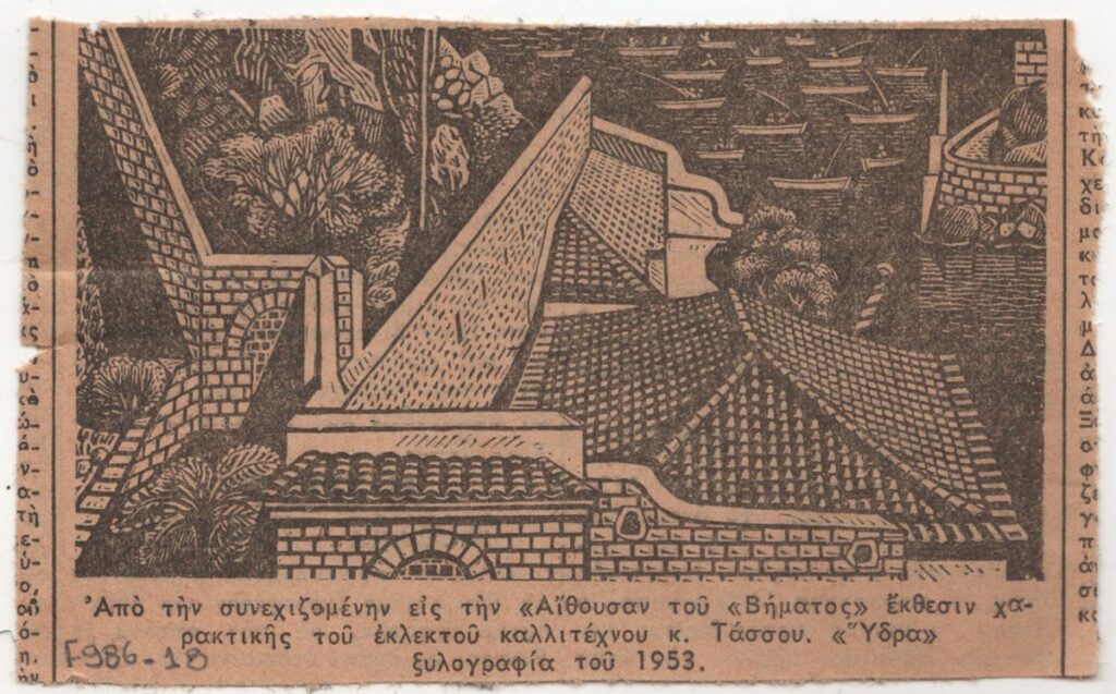 A newspaper clipping, featuring a photograph of an artwork by A. Tassos, presented in an exhibition at the “Bima” Exhibition Venue in Athens.