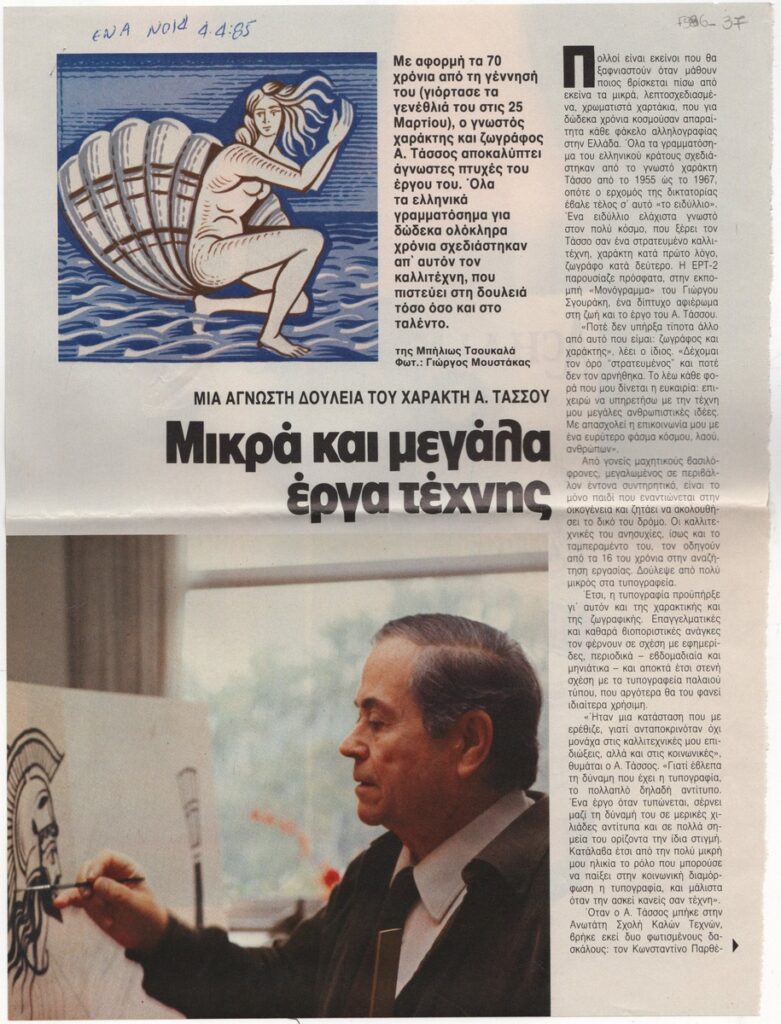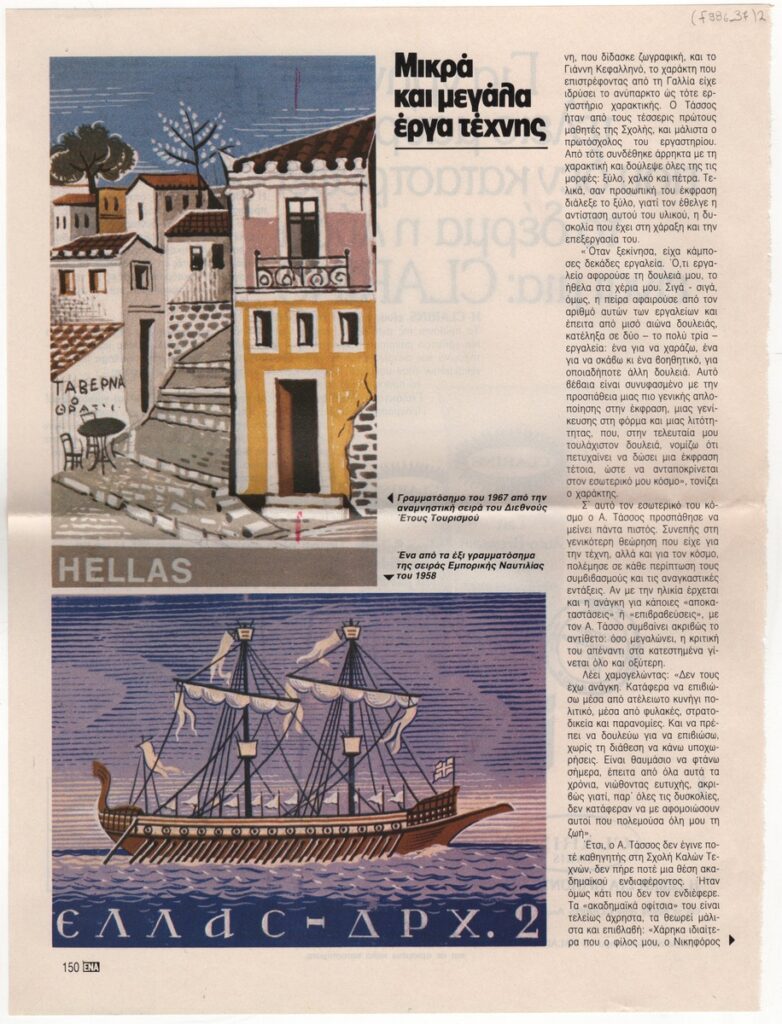 A clipping from the magazine “Ena”, dated April 4, 1985, featuring an article about the stamps designed by the engraver A. Tassos.